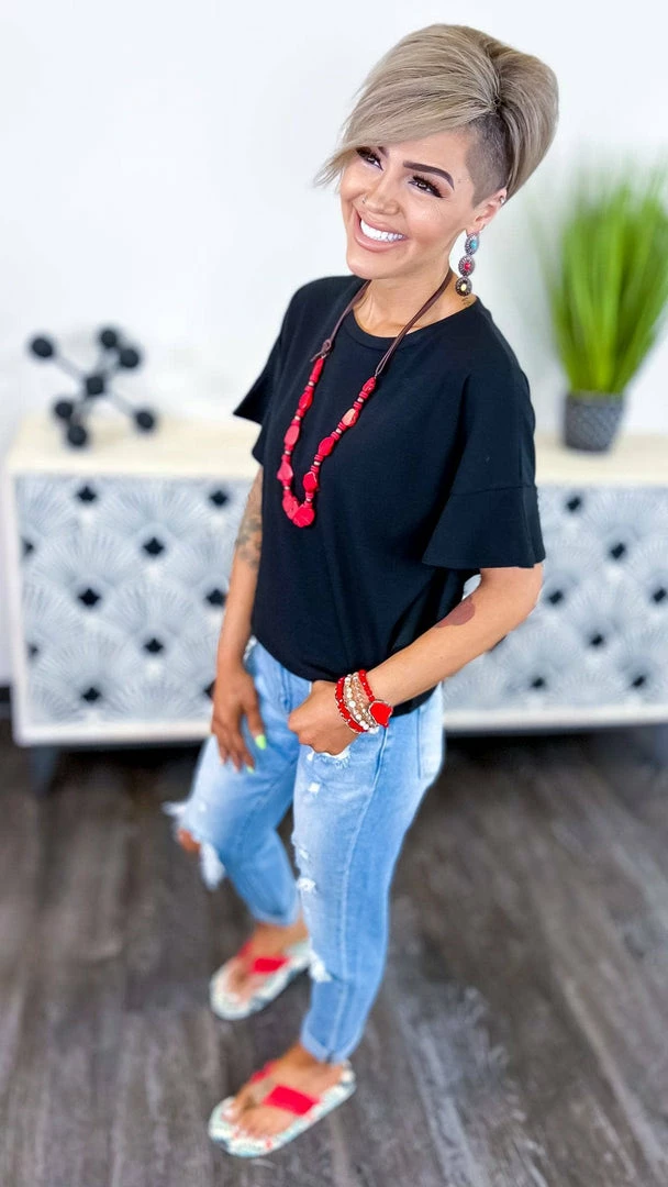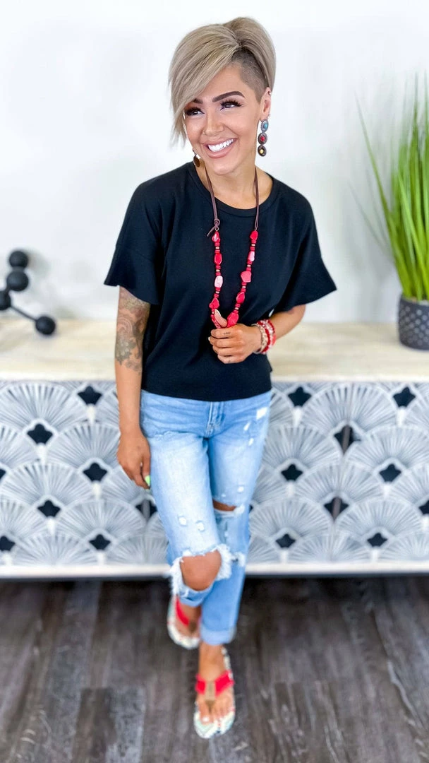 A new top that was made by us for you and is sure to satisfy all of your fashion needs this season!Β We are absolutely in love with thisΒ ribbedΒ print, flutter detail on the sides, and boxy fit! Wear this with jeans or shorts and add a fun pop of color with your shoe selection!Β