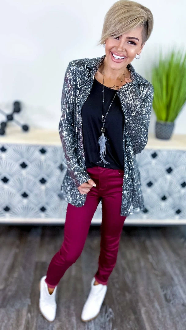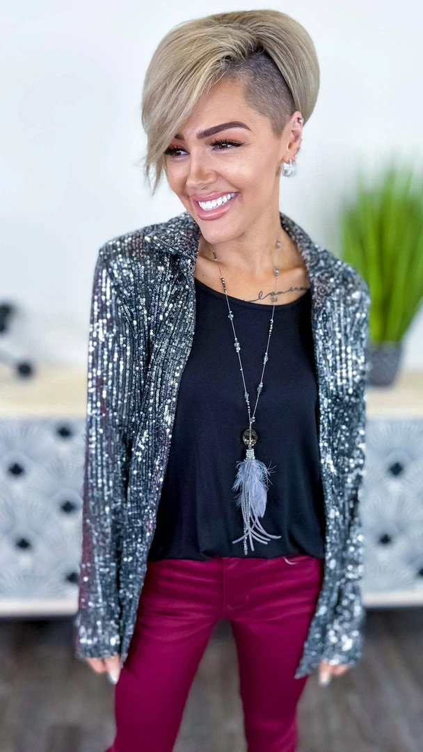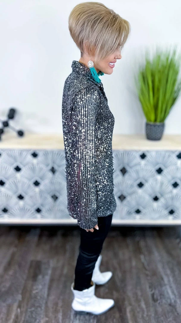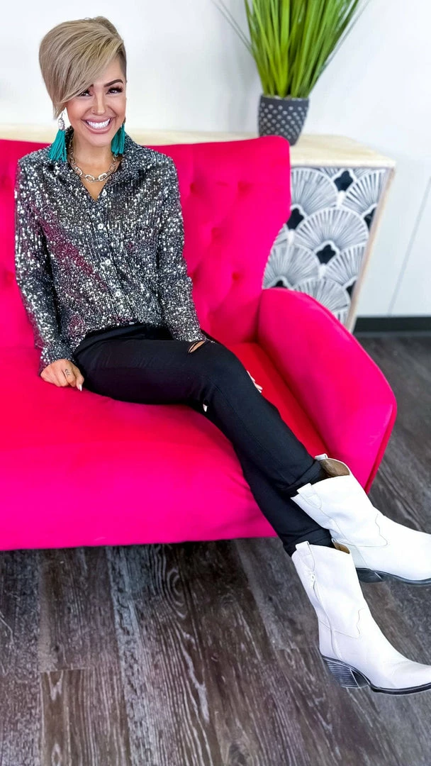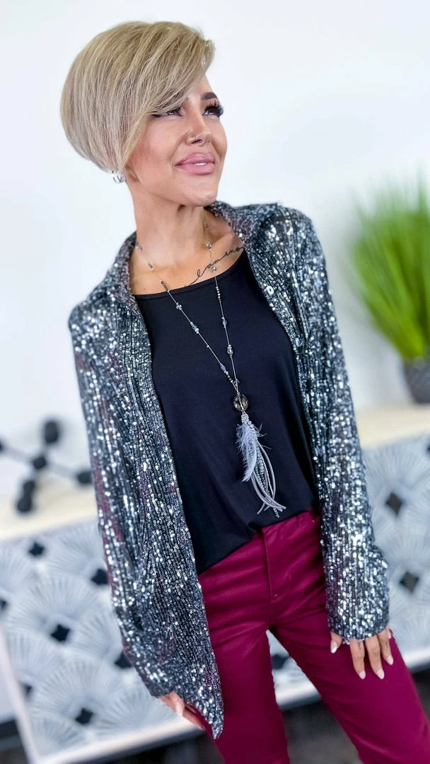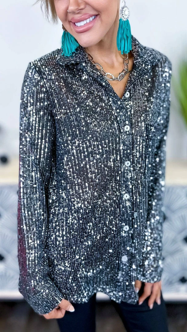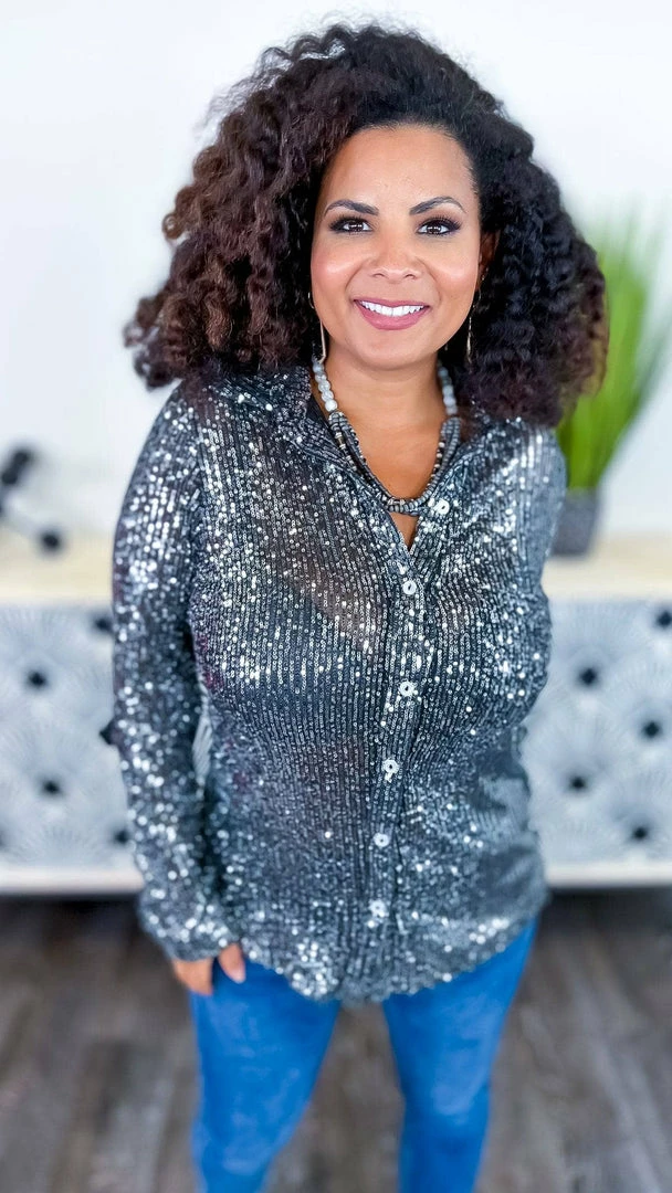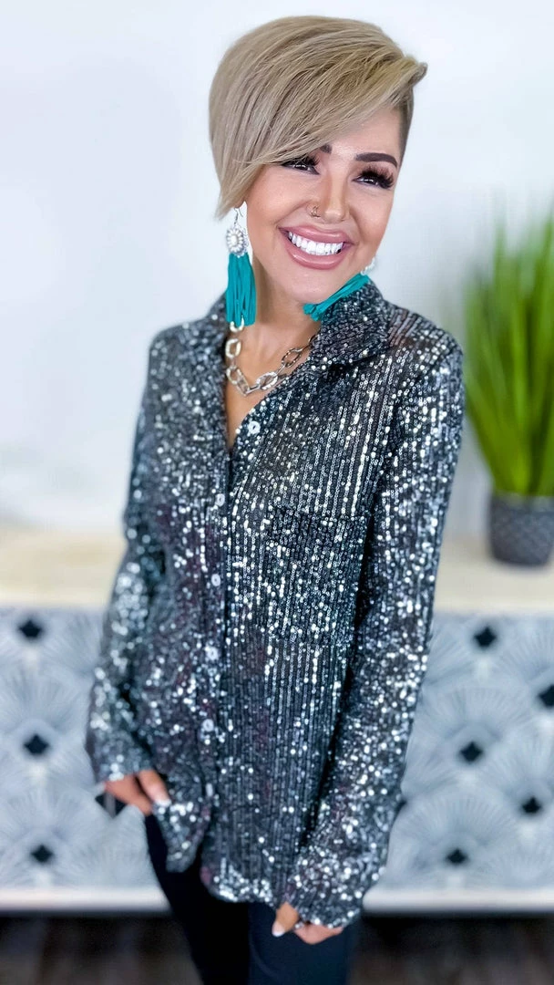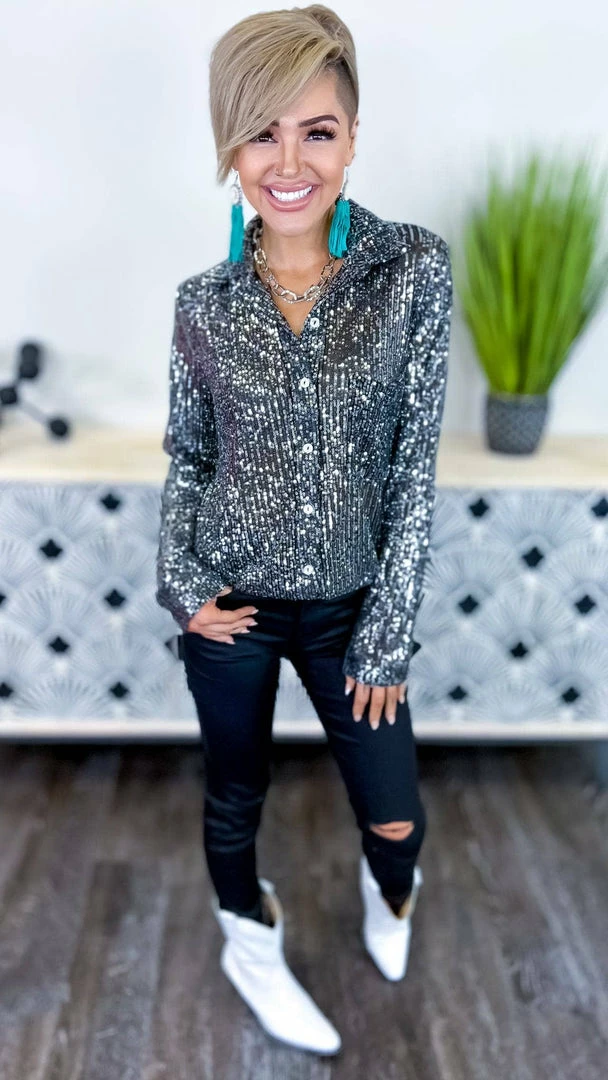 The ZigZag Stripe’s Charcoal Expect The Best Top is the perfect piece to add a little something extra to your outfit. This button-up top features long sleeves and sequin details that are sure to turn heads. Made from a soft and lightweight fabric, this top is comfortable to wear all day long. Pair it with your favorite jeans or skirt for a complete look.