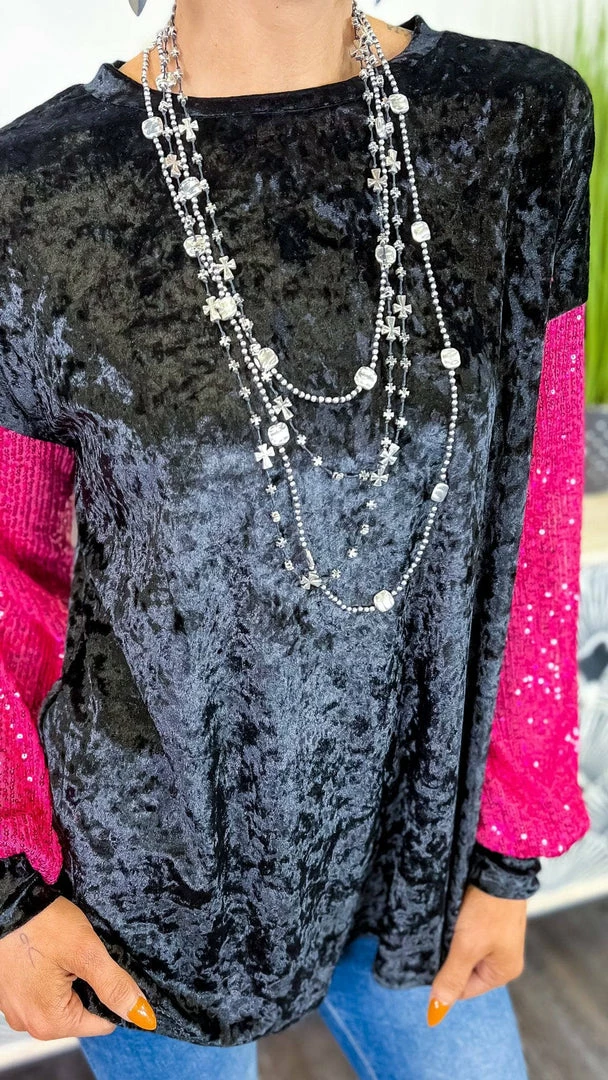 Look as glamorous as ever with this luxurious top. With a touch of sparkle, this top is perfect for a night on the town. The black velvet adds a touch of sophistication, while the fuchsia sequin gives you a touch of glamor. Dress up or dress down this top to fit your needs. With its versatile style, you’ll want to wear it everywhere.