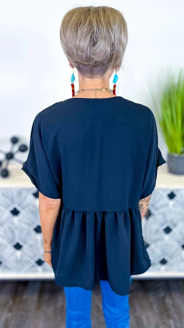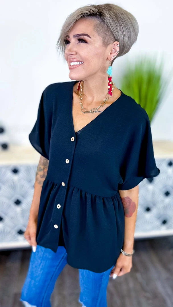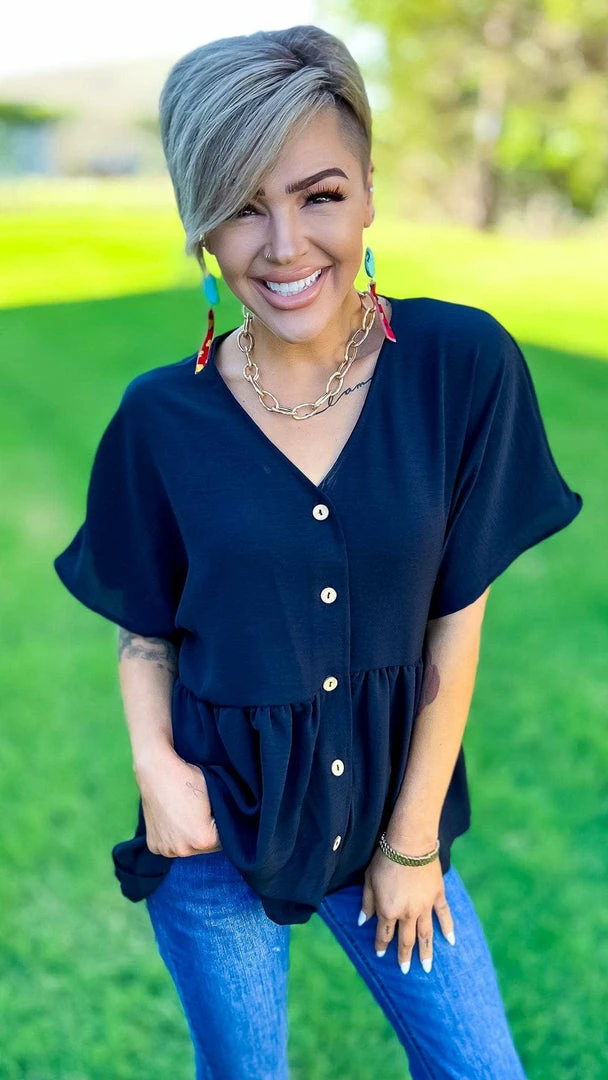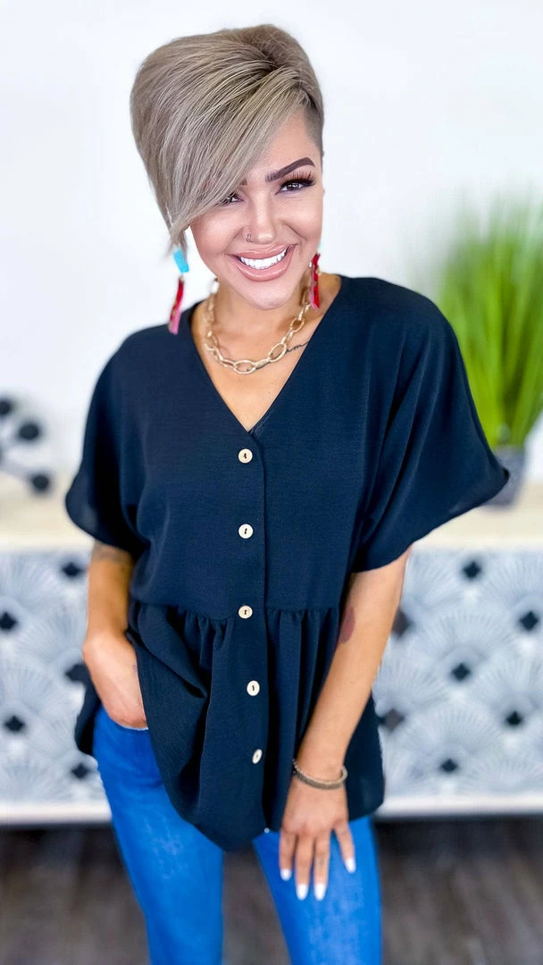 The ZigZag Stripe’sΒ Black Trip to Venice Top is the perfect button-down babydoll top for your next European getaway. With its button-down front and babydoll silhouette, this top is both stylish and flattering. TheΒ black color is perfect for a fun trip. Made of 100% polyester, this top is both comfortable and breathable. Pairs perfectly with jeans and a sun hat.