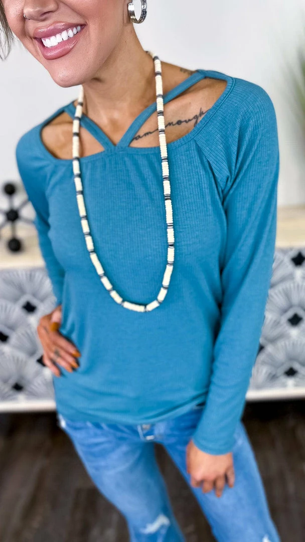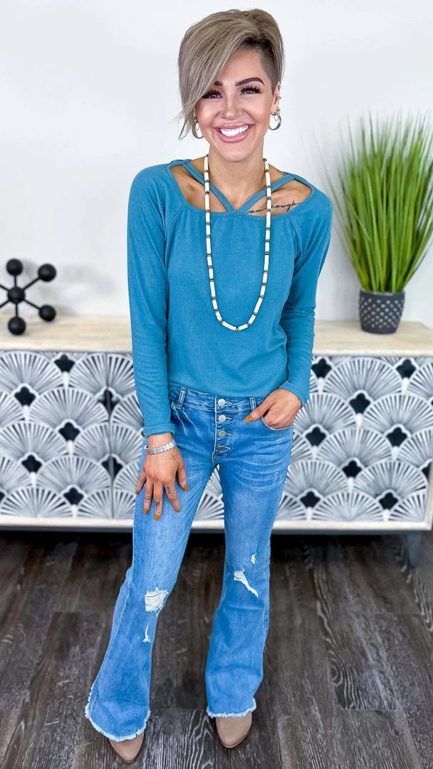 The ZigZag Stripe’s Blue Daring Beauty Top is the perfect way to add a touch of style to your everyday wardrobe. This long sleeve top features a keyhole cutout and ribbed detailing for a unique and stylish look. The solid blue color is perfect for pairing with your favorite jeans or skirts. You’ll love the way you look and feel in this daring and beautiful top.