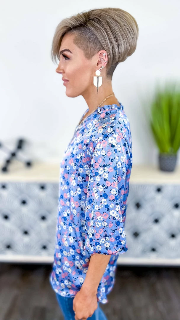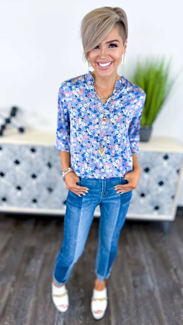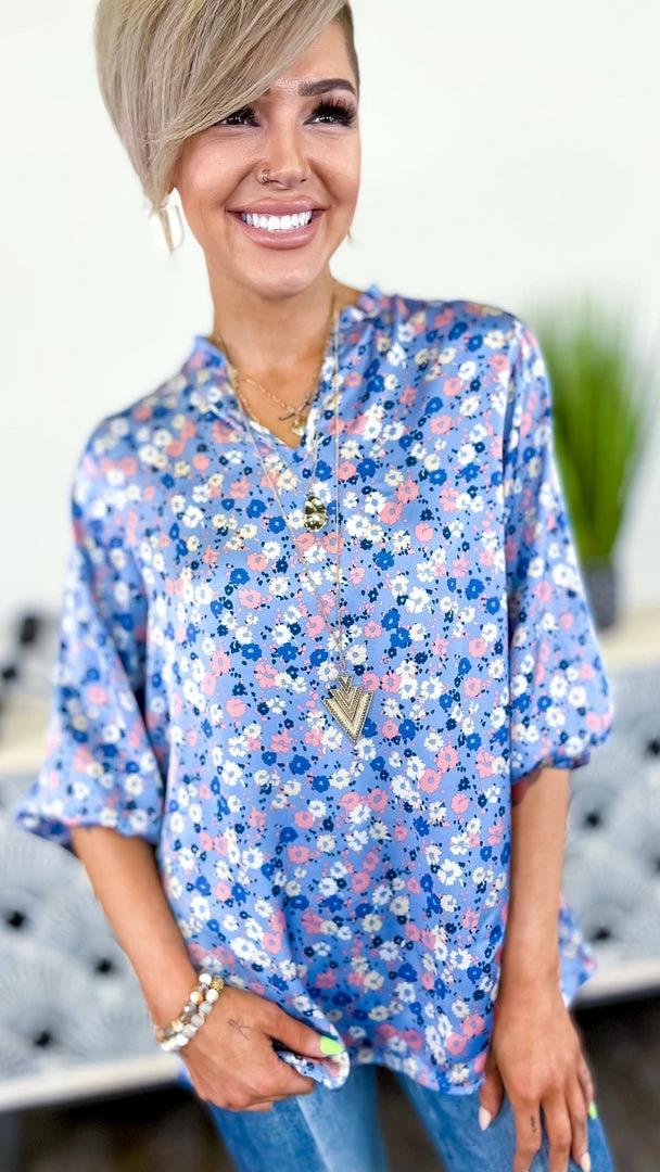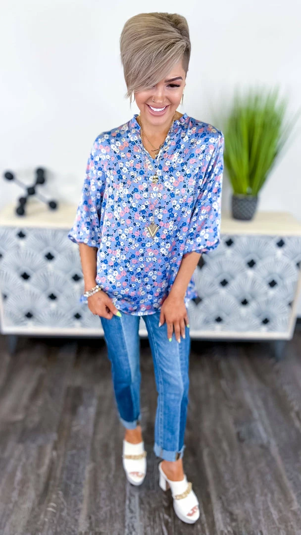 The ZigZag Stripe’s Blue Reliable Love Top is a must-have for your next big event. The satin-like fabric and floral print make this top a stunner. The 3/4 sleeve top is perfect for showing off your favorite bracelet or watch. You’ll love the way you feel in this top.