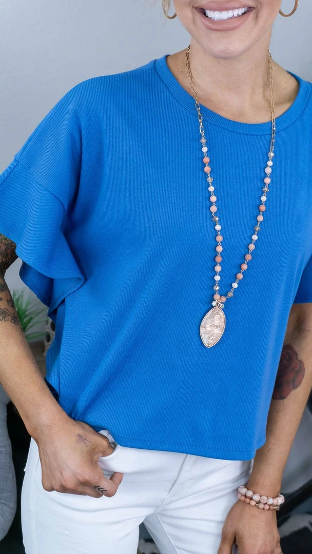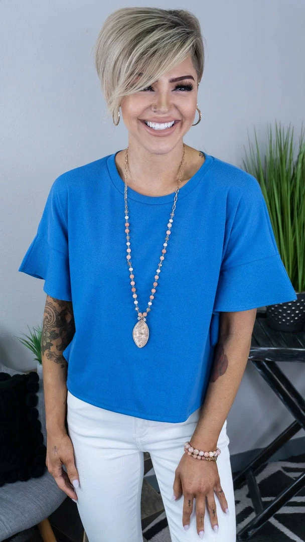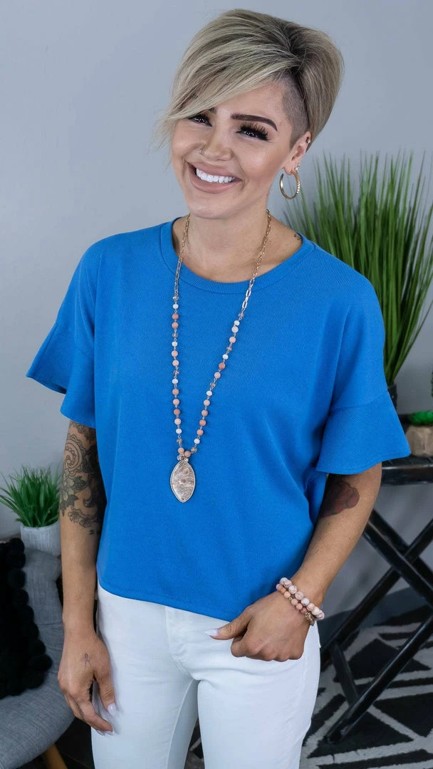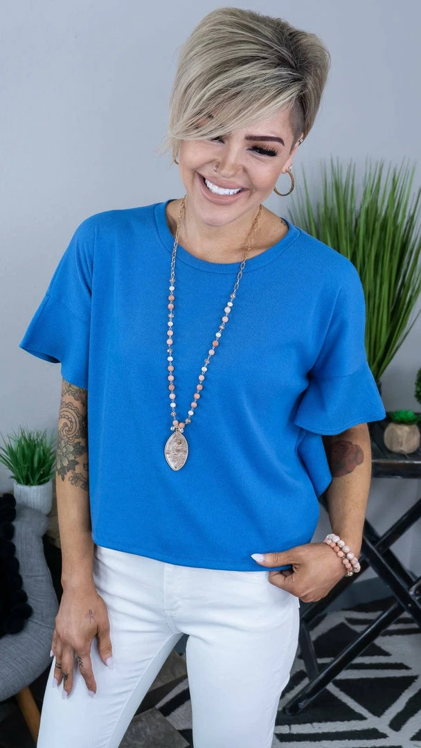 A new top that was made by us for you and is sure to satisfy all of your fashion needs this season!Β We are absolutely in love with thisΒ ribbedΒ print, flutter detail on the sides, and boxy fit! Wear this with jeans or shorts and add a fun pop of color with your shoe selection!Β
