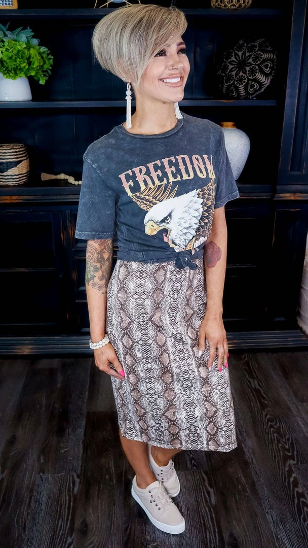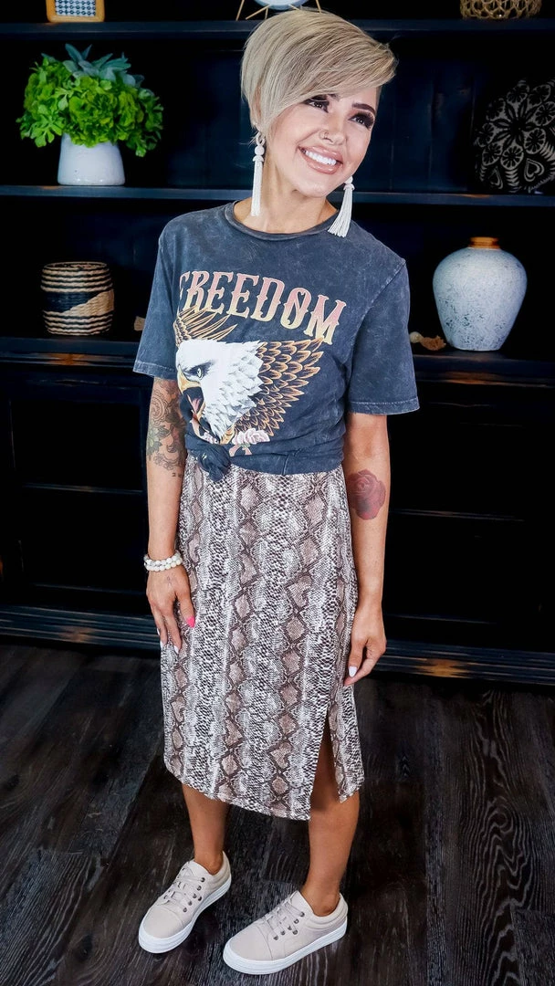 The My Generation Skirt is perfect for a fun night out! With a snake print design, this skirt is bound to turn heads. The ZigZag Stripe brand provides trend-setting fashion made by US for YOU, and this skirt is no exception. The My Generation Skirt is perfect for a night on the town!