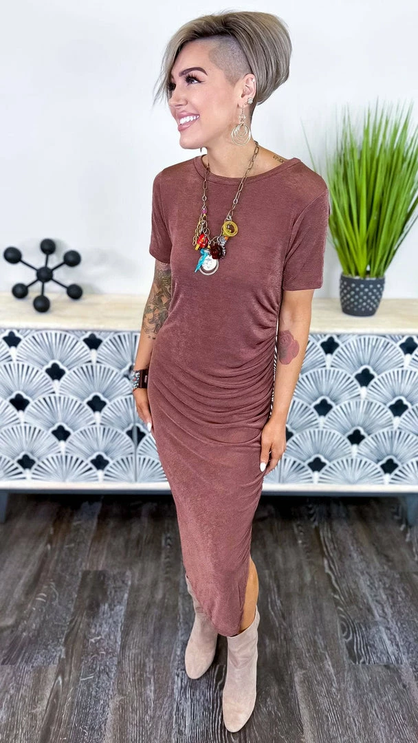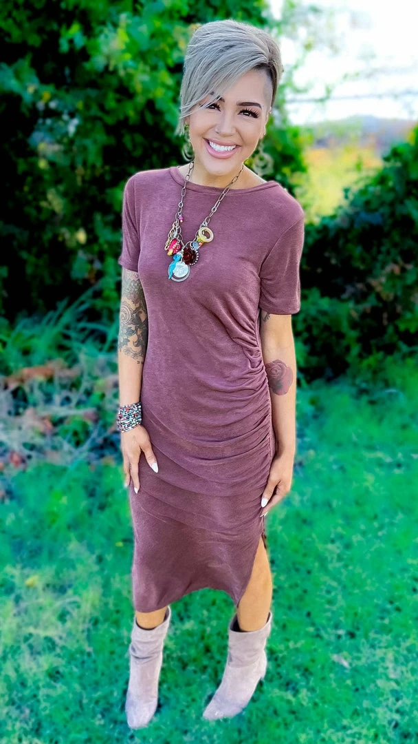 The ZigZag Stripe’sΒ Brown Dancing Alone Dress is the perfect way to show off your moves–and your style. ThisΒ brown midi dress features aΒ unique side ruching that gives this dress an extra special touch makingΒ you feel beautiful and confident whether you’re shaking it on the dance floor or walking into a meeting. The luxurious fabric is lightweight and breathable, making it comfortable to wear all day long. Plus, the chicΒ brown hue is perfect for any season. Add this dress to your wardrobe and get ready to dance the night away.