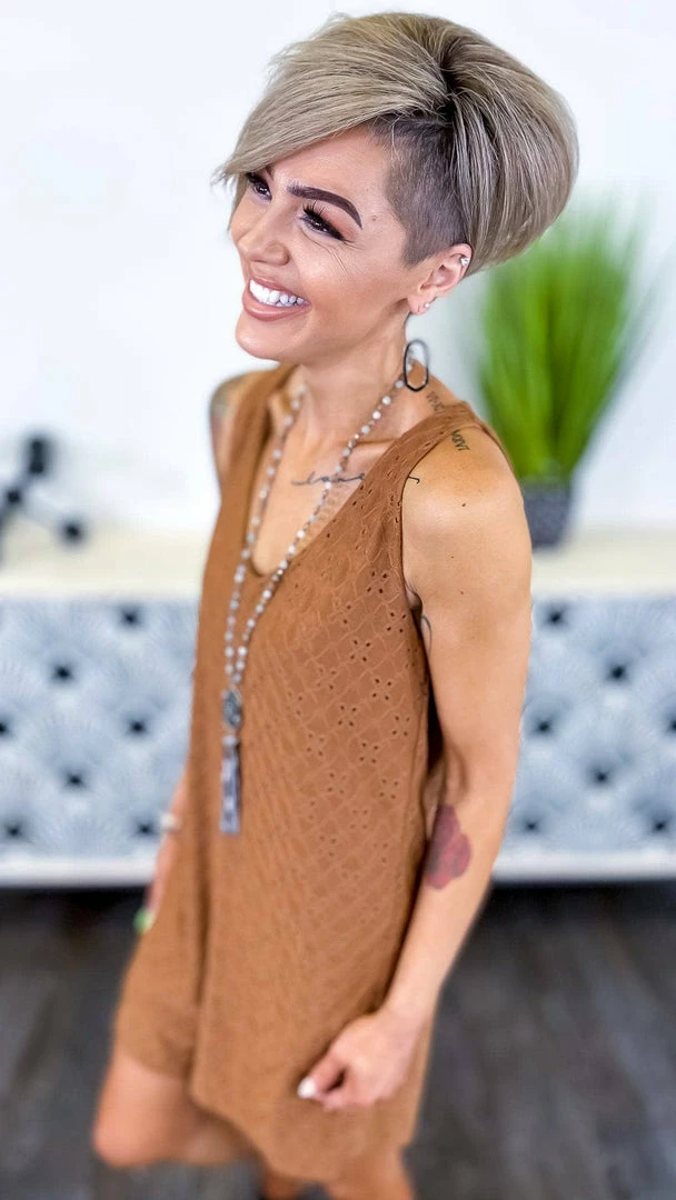 This romper is perfect for any occasion! The Graceful Feelings Romper is made with beautiful eyelet fabric and delicate lace. It has a solid brown color that makes it easy to dress up or down. With its comfortable fit and elegant style, this romper is a must-have for any summer wardrobe.