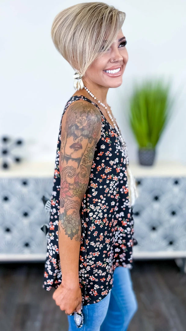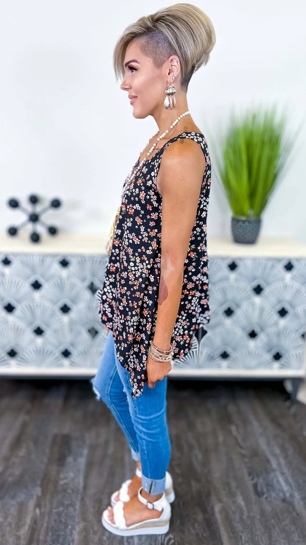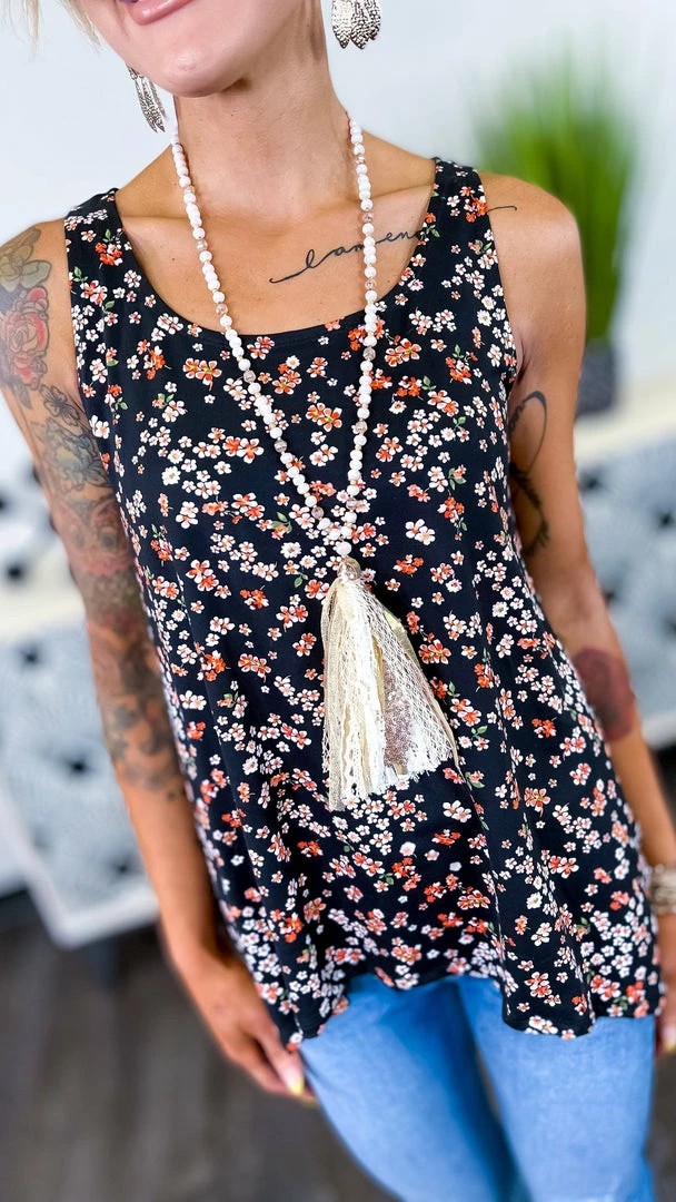 A little reminder for your daily thoughts. This is the kind of tank that helps you get out of bed in the morning and face the day with a smile. Made with a soft and flowy fabric, this sleeveless top features a sharkbite hem and a rounded neckline. The floral print is perfect for adding a pop of color to your outfit.