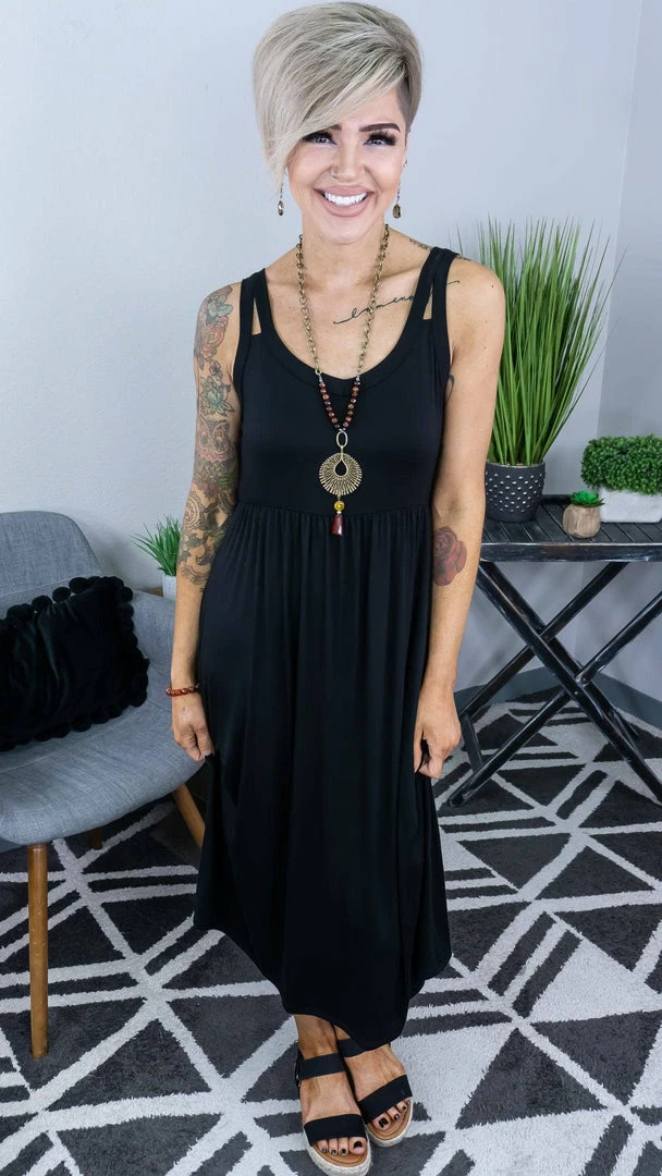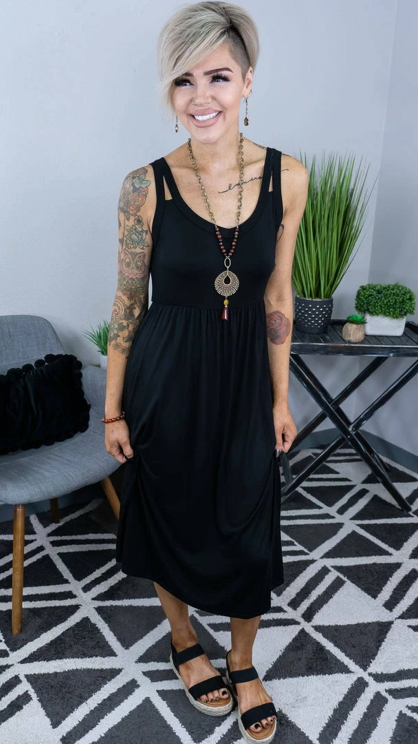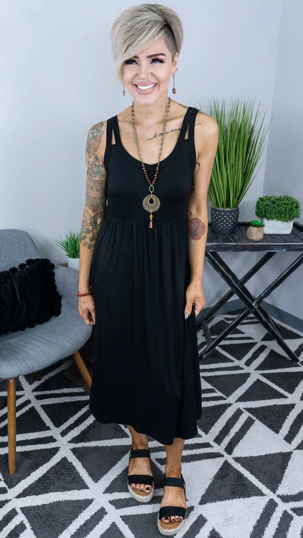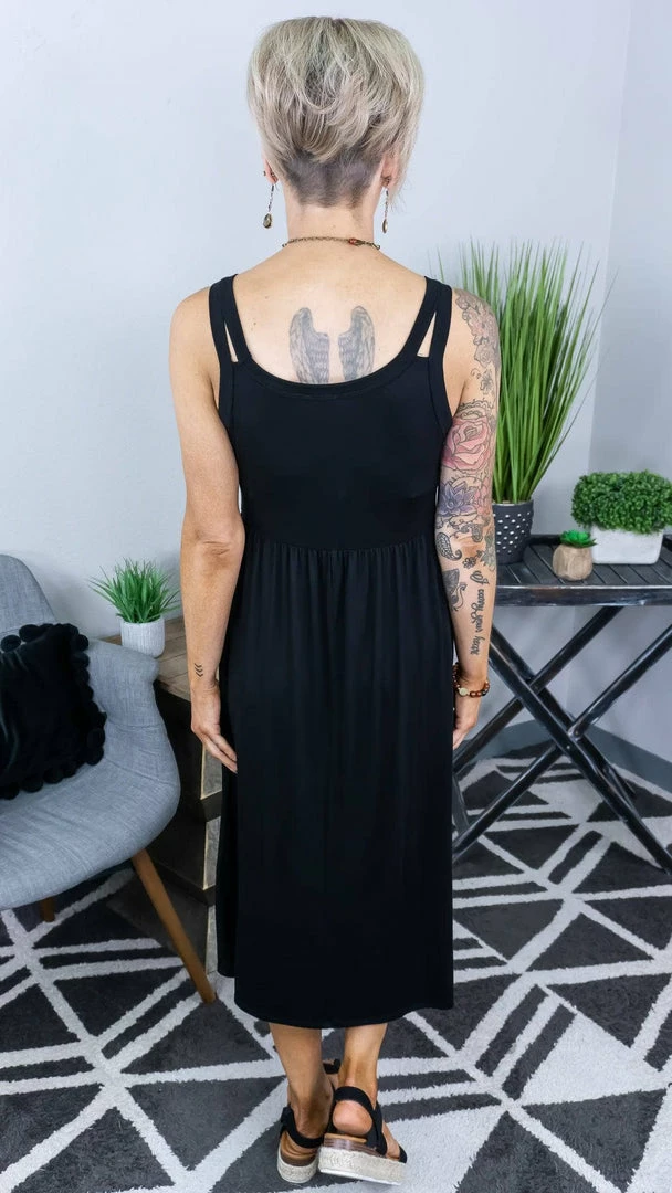 A dress that was made by us for you and is sure to be an undeniable piece to add to your wardrobe this season! The midi length of this dress is perfect to show off a cute pair of shoes. Get creative and layer all your favorite outwear with it too!