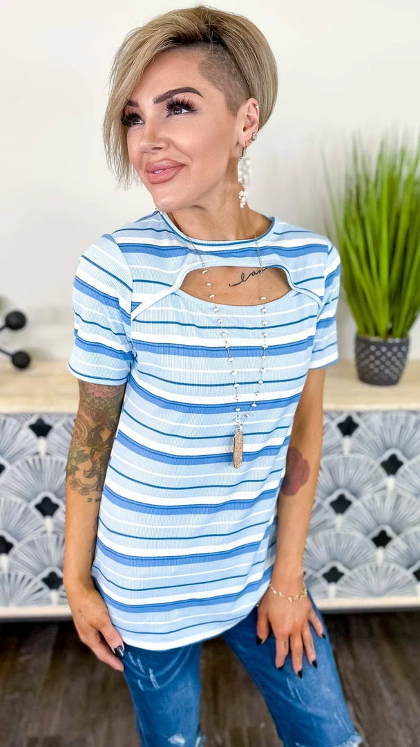 The perfect top for any day. With its versatile style, this blue multi-stripe top can be dressed up or down. Featuring an oval keyhole detail, it adds a touch of sophistication. Make a statement in this top whether you’re headed to the gym or out for dinner.
