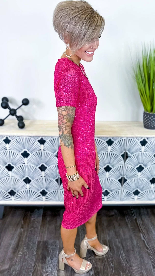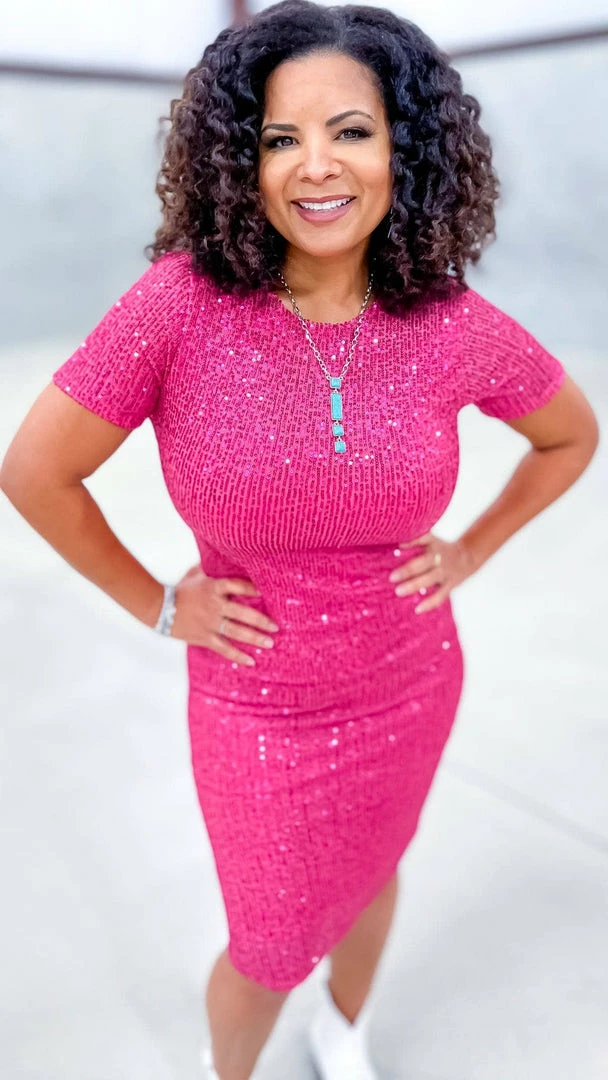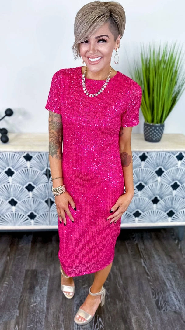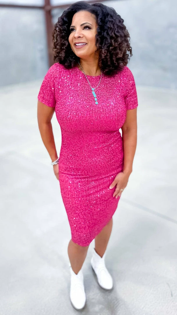 Get busy slaying in this fuchsia midi dress. The ZigZag Stripe’s signature sequin adorned dress is perfect for your next big event. Whether you’re attending a gala, a wedding or a night out on the town, this dress will have you looking and feeling your best. The figure-flattering silhouette will accentuate your best features, while the sequins will add a touch of glamor. Get ready to turn heads in this show-stopping dress.