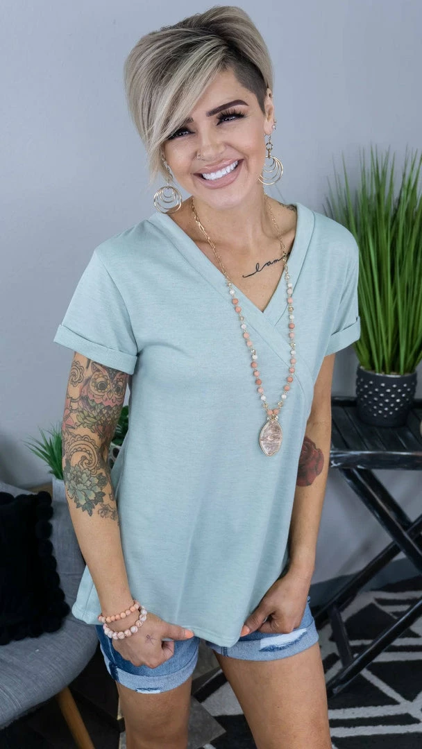 Add this new flirty ZZS solid top to your wardrobe! This top features a criss-cross v-neck hemline, cuffed short sleeves, and an added bonus is that this top is reversible! Wear it with the v-neck in the front or back depending on what style you’re feeling that day!