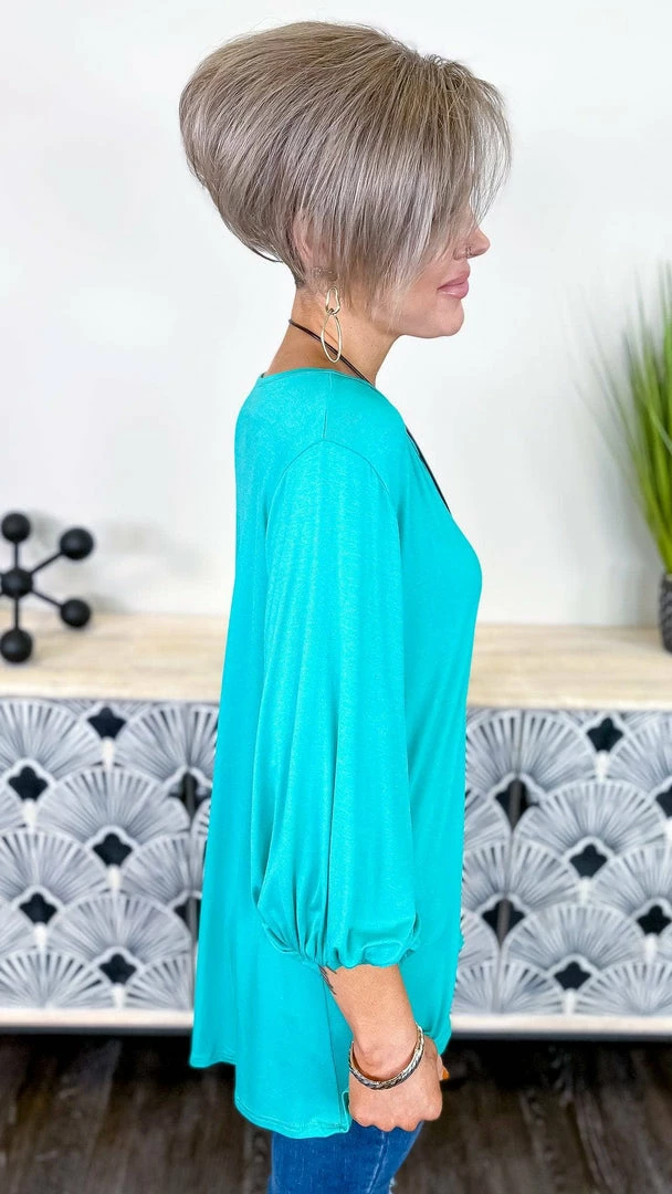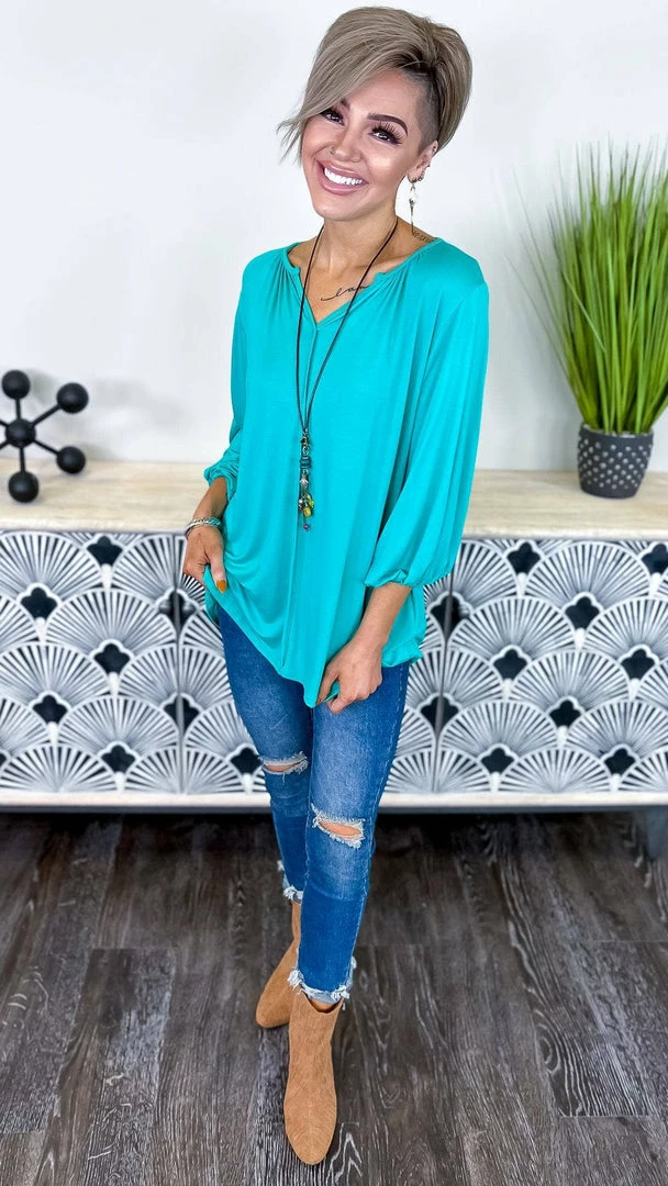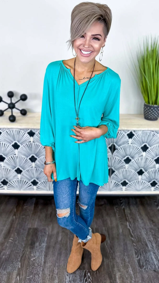 All eyes are on you in this new ZZS basic! The v-neck silhouette of this top is super flattering, and the raw hem detail down the front gives it just the right amount of edge. The 3/4 sleeves make it perfect for transitional weather. You’ll love the way you look and feel in this top.