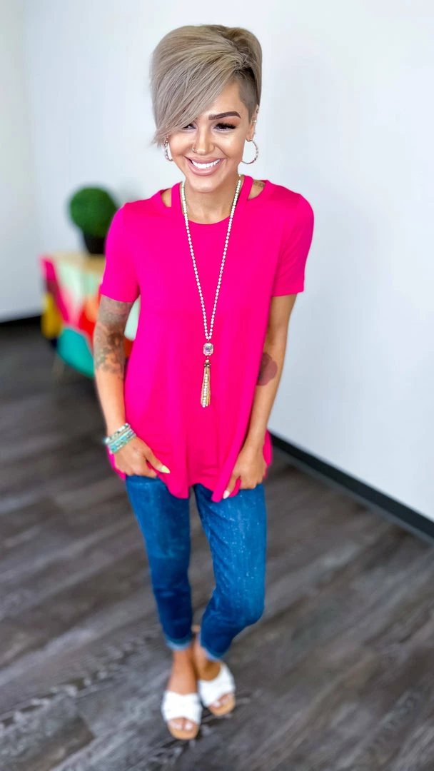 Looking for a hot pink top that’s both cute and stylish? Look no further than The ZigZag Stripe’s Hot Pink New Clues Top. This basic top is perfect for any occasion, and the shoulder cut-outs add a touch of drama. The hot pink color is perfect for any season, and the short sleeve top is perfect for any weather.