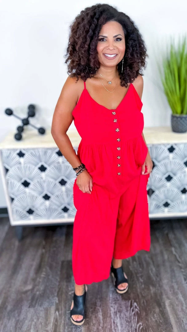 The ZigZag Stripe’s You Shine Jumpsuit is the perfect addition to your spring/summer wardrobe. This red sleeveless jumpsuit features spaghetti straps, a button closure and a flattering fit.Β