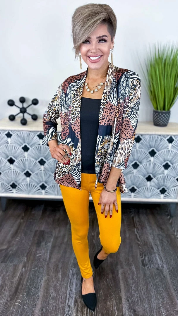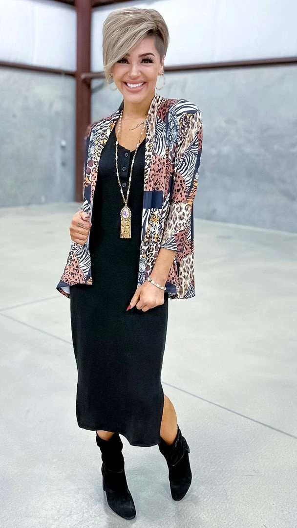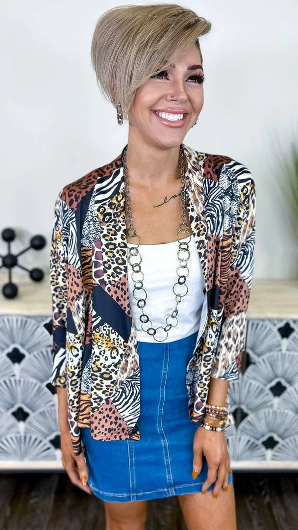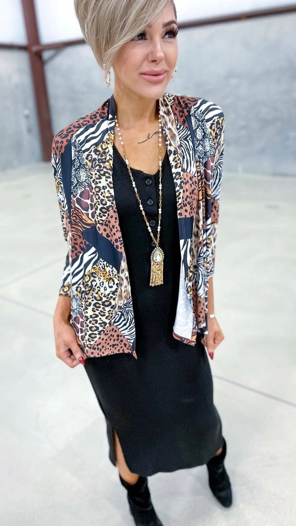 Wrap yourself in luxury with our Lifetime of Luxury Cardigan. This luxurious open cardigan is perfect for a glam evening out. The mix of animal prints is sure to turn heads, while the 3/4 length sleeves keep you cozy all night long. With its timeless style, this cardigan will be a closet favorite for years to come.