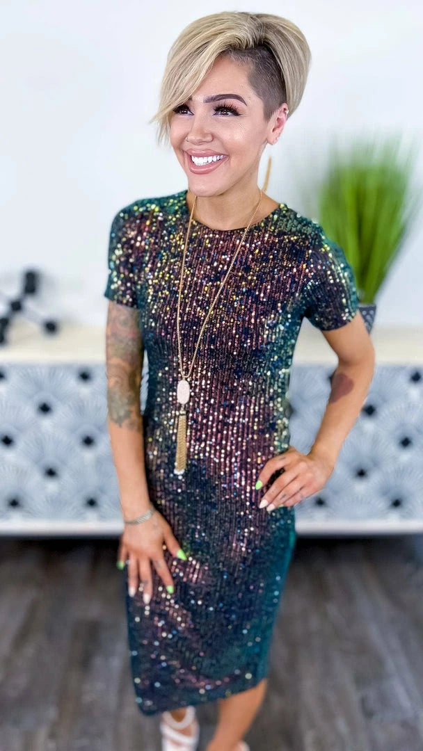 The Zig Zag Stripe knows how to slay all day in this sequinΒ multi midi dress. This party dress is perfect for all of your events. TheΒ multi color is eye-catching and will add some glamor to any party. The sequins and midi length make this dress perfect for a formal event or a night out on the town.
