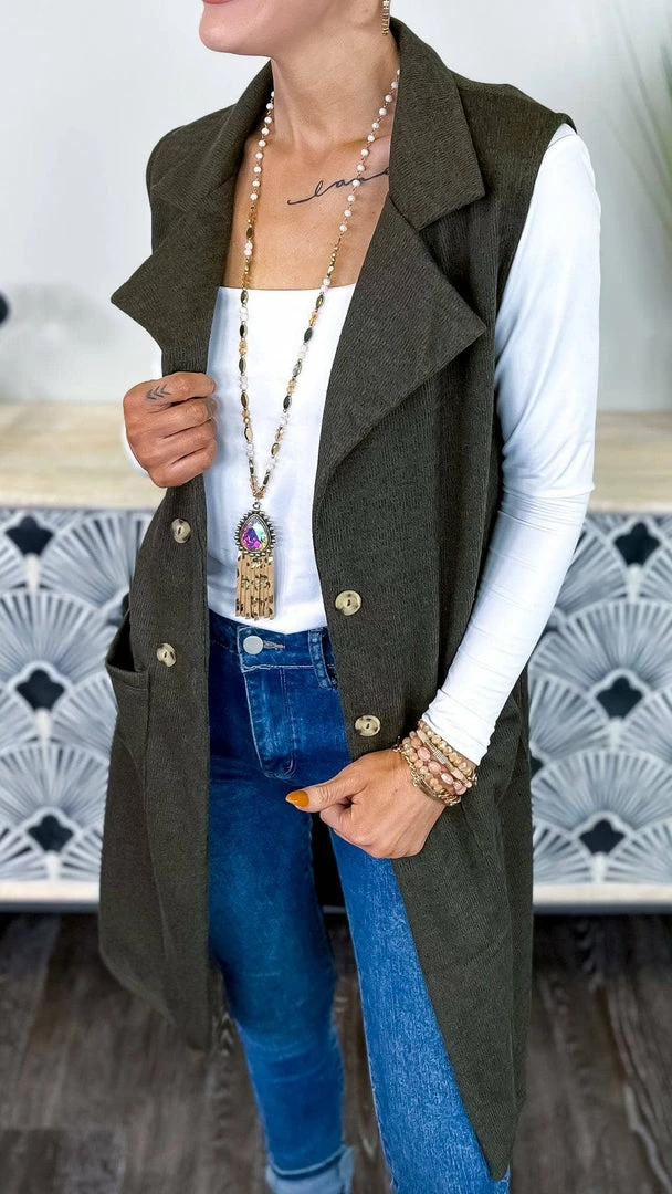 Up your layering game with thisΒ Green Cypress Grove Vest from the ZigZag Stripe. This sleeveless blazer can be worn as a vest or over a shirt for an extra touch of style. The button detail adds a touch of sophistication.