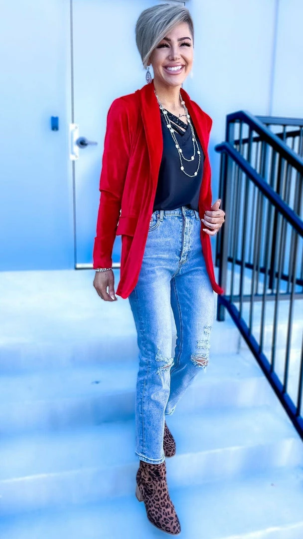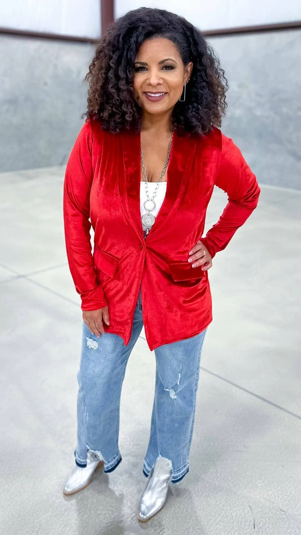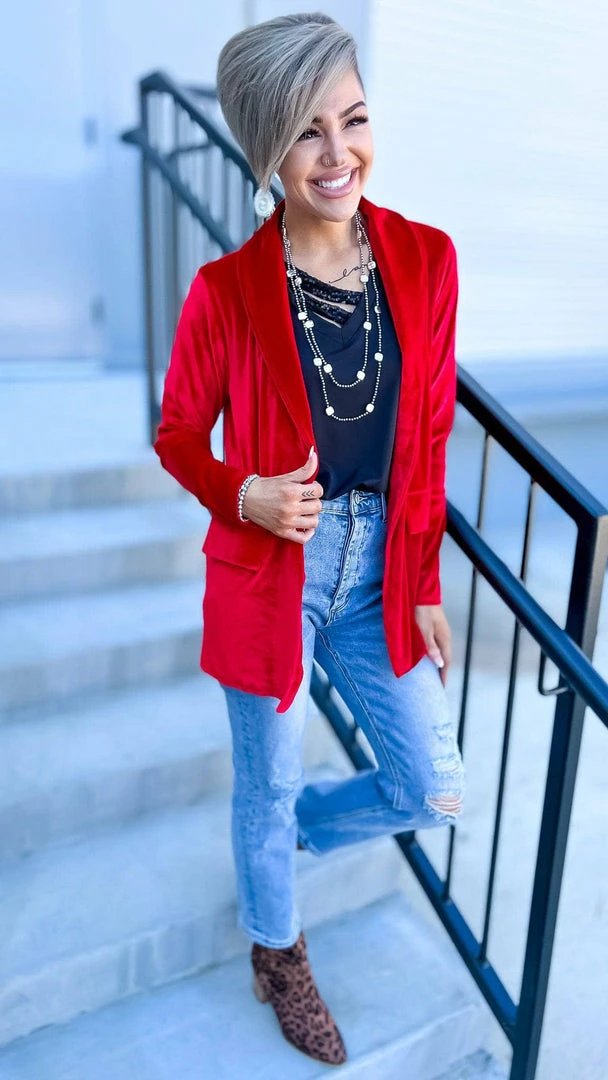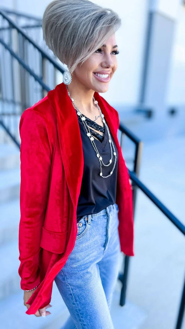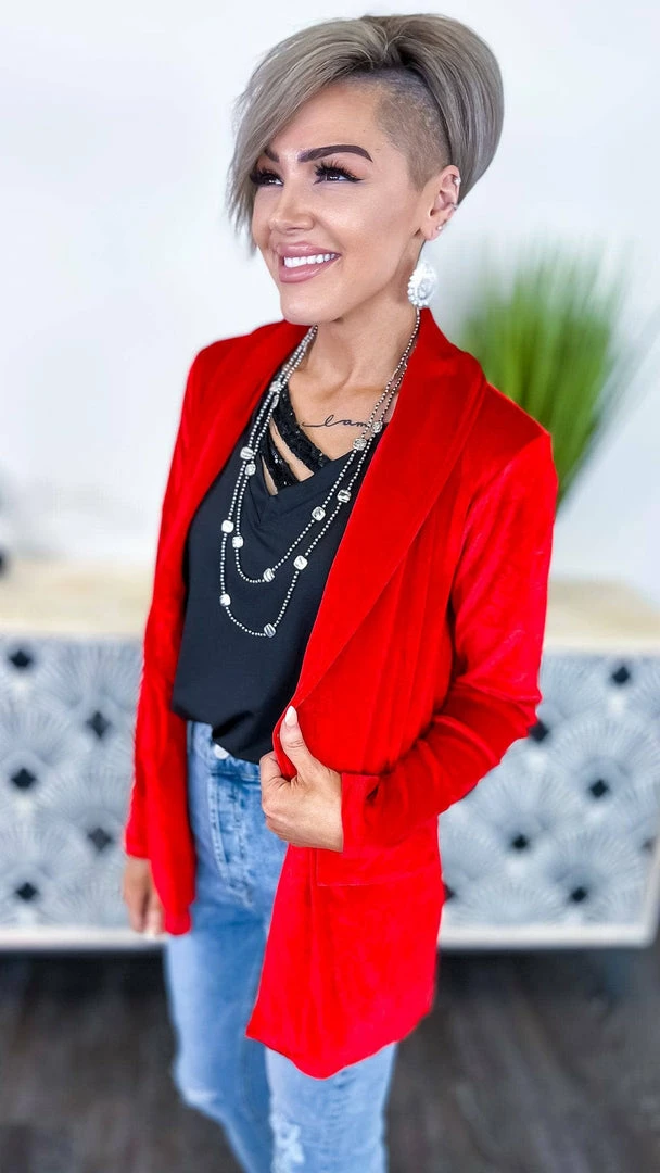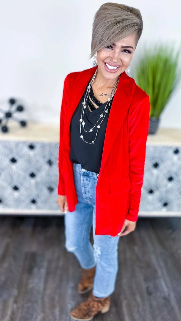 You had me at VELVET!Β A gorgeous red blazer with an open front, full-length sleeves, and two front pockets.Β Β Super comfortableΒ and soΒ chic!Β Made by us, for YOU!