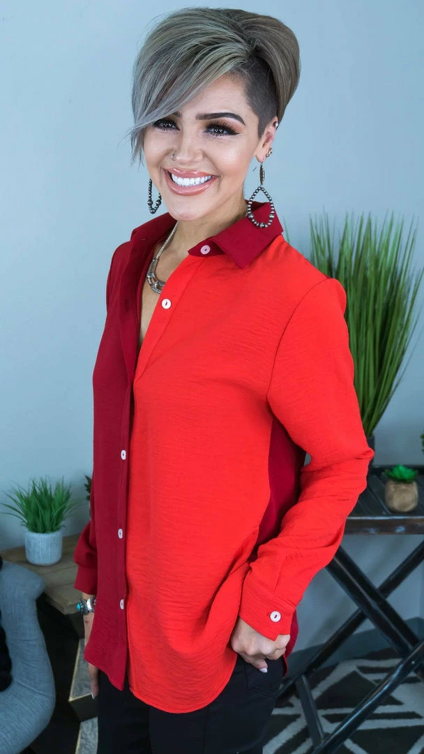 You’ll be ready for happy hour with this super cute two-tone color block top. This button down shirt is sure put you in the mood for a cocktail or two!