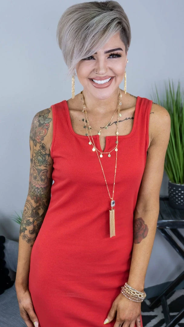 Consider this ZZS dress when upgrading your style! This dress features a ribbed knit material, a knee-length, and a square neckline with a small v-neck. This dress will be perfect to style with platform wedges, sneakers, or sandals!Β