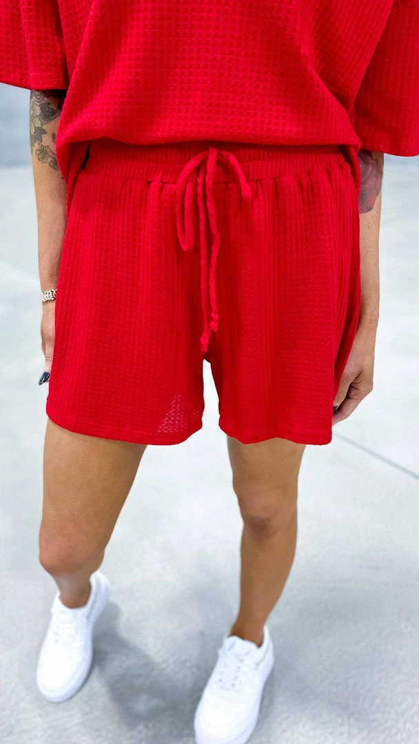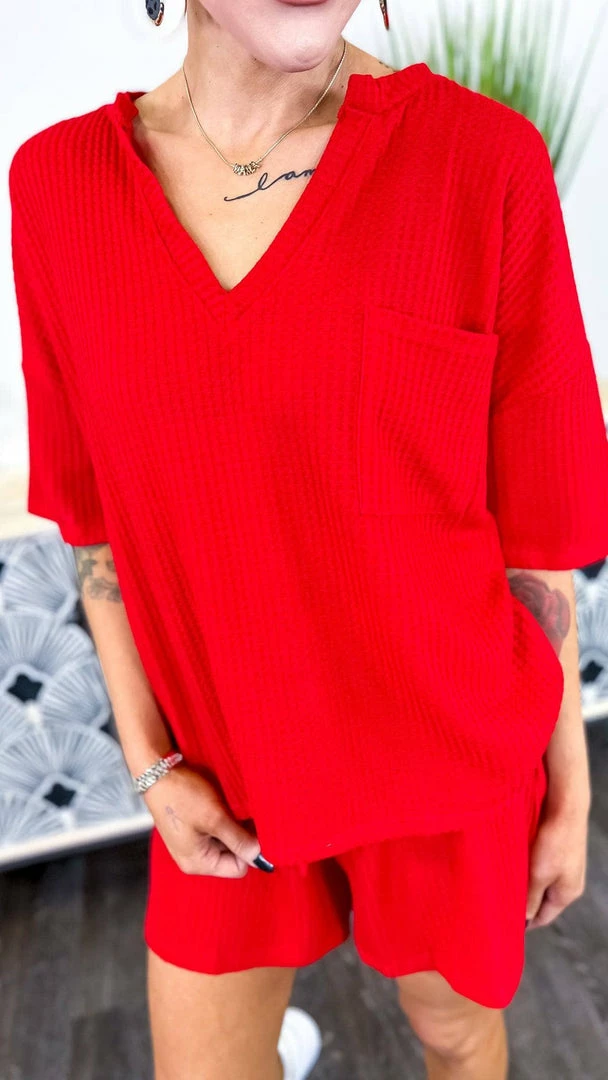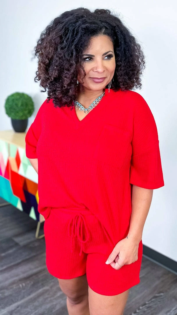 The ZigZag Stripe’sΒ Red Gorgeous Dreamer Set is the epitome of comfort. This two piece set features drawstring shorts and a pocket top, both made with waffle fabric. The perfect lounge wear, this set will have you feeling pretty and comfortable all day long. With a v-neckline and short sleeves, this set is also perfect for a lazy day around the house.