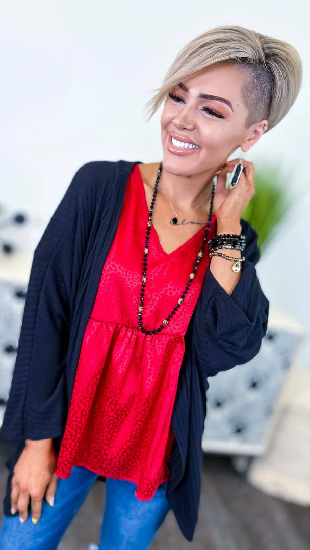 The ZigZag Stripe’sΒ Red Leopard City Sleek Top is a babydoll top with a difference. Made with luxurious satin leopard print fabric, this top is sure to turn heads when you walk into the room. The short sleeves and babydoll cut make it the perfect top for a night out on the town. You’ll be looking and feeling like a glamorous queen in no time.