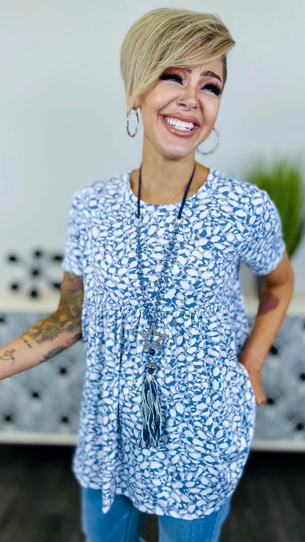 A wild and stylish top that is made by US for YOU that we know you’re going to love. A fun and playful top that’ll add a vintage blue animal print to your wardrobe. With a babydoll silhouette and short sleeves, this top is perfect for summer. Dress it up with a skirt and heels for a night out, or wear it with jeans and sneakers for a casual day look.