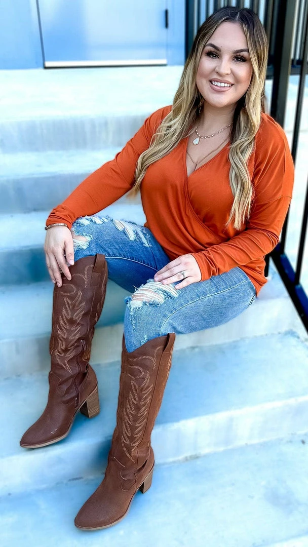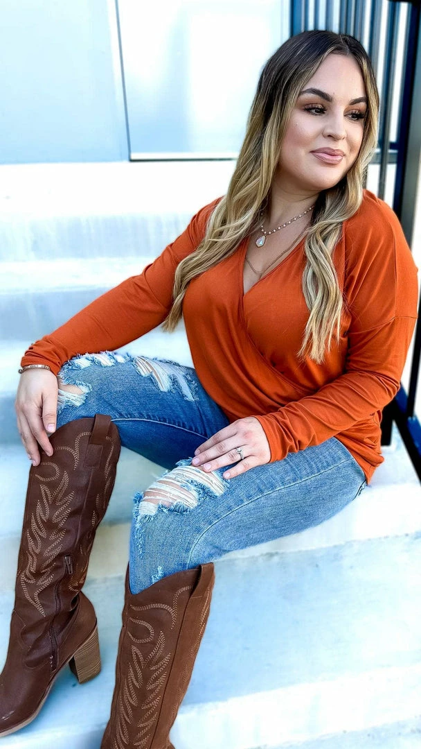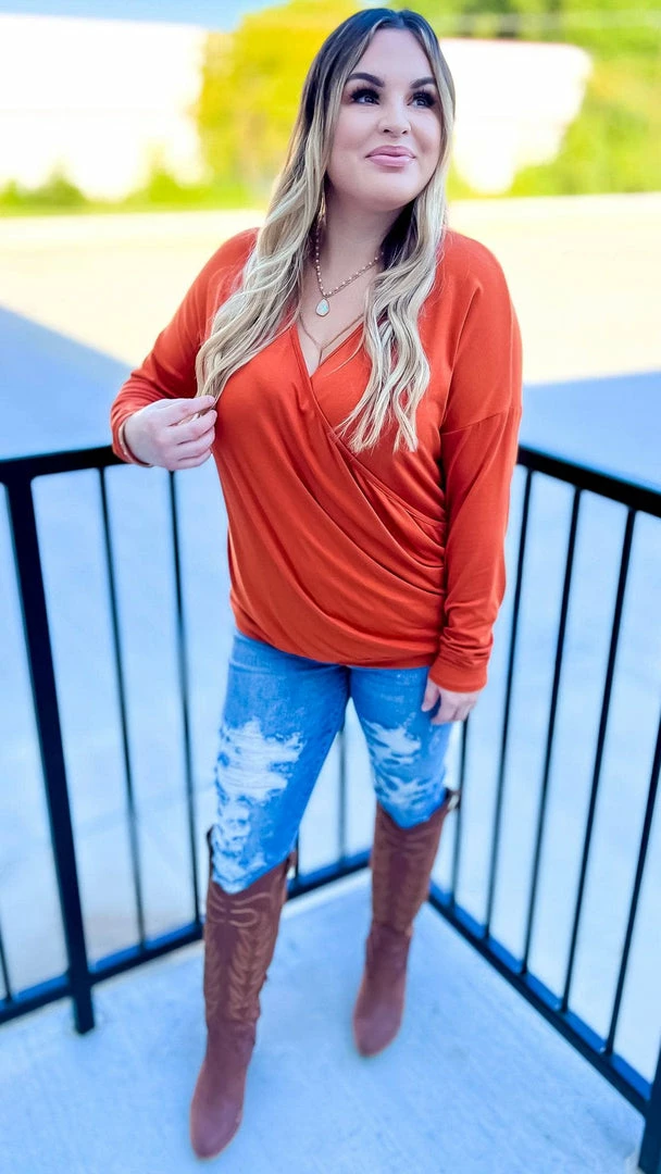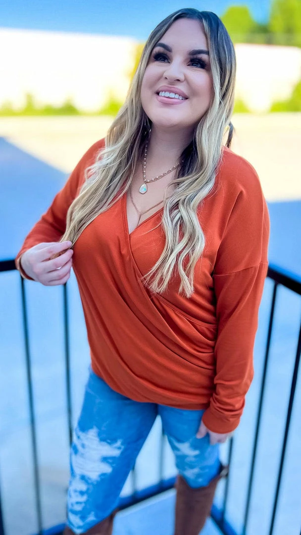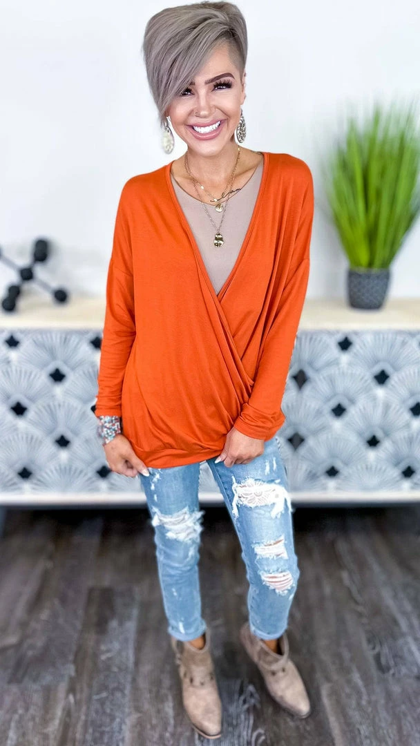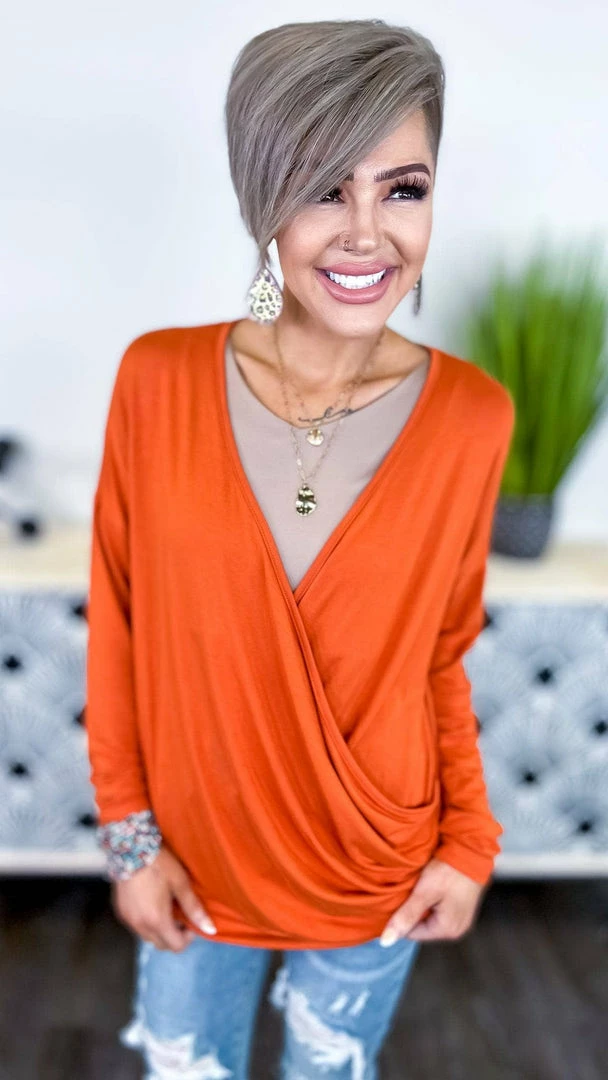 This solid orange top from the ZigZag Stripe is a divine addition to your wardrobe. Its soft and lightweight fabric makes it a perfect go to top. With a stylish crossover hemline and v-neck, this top is perfect for all occasions. Whether you’re dressing it up or down, this top is a must-have in your wardrobe.