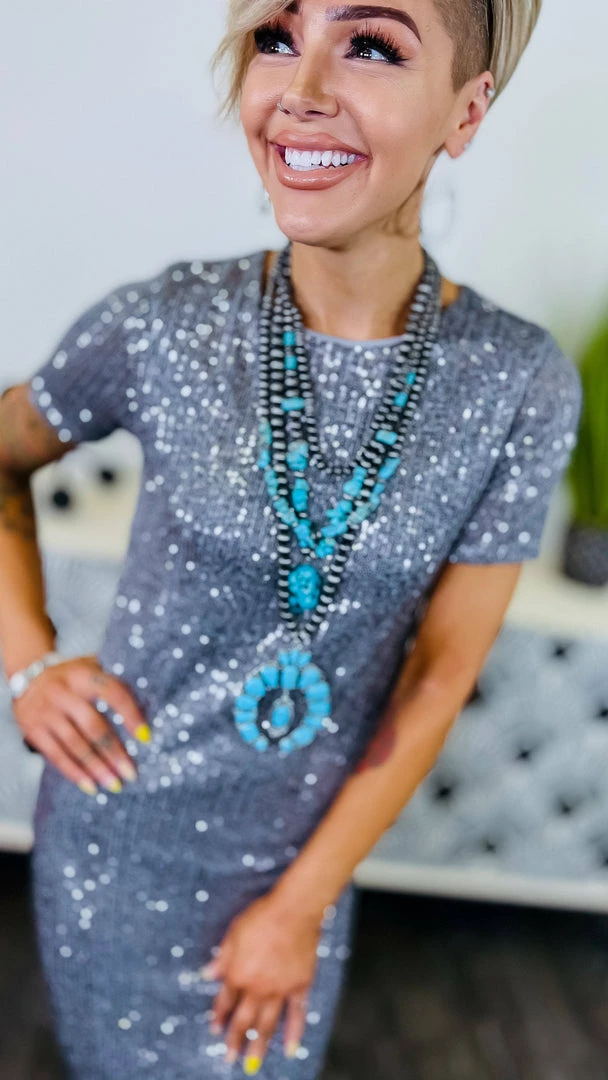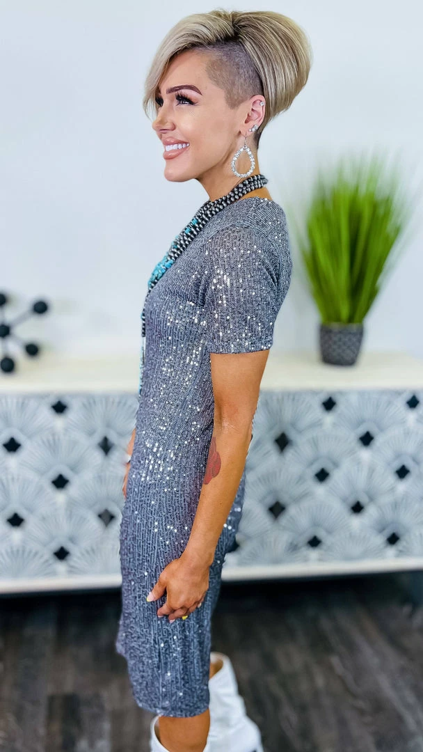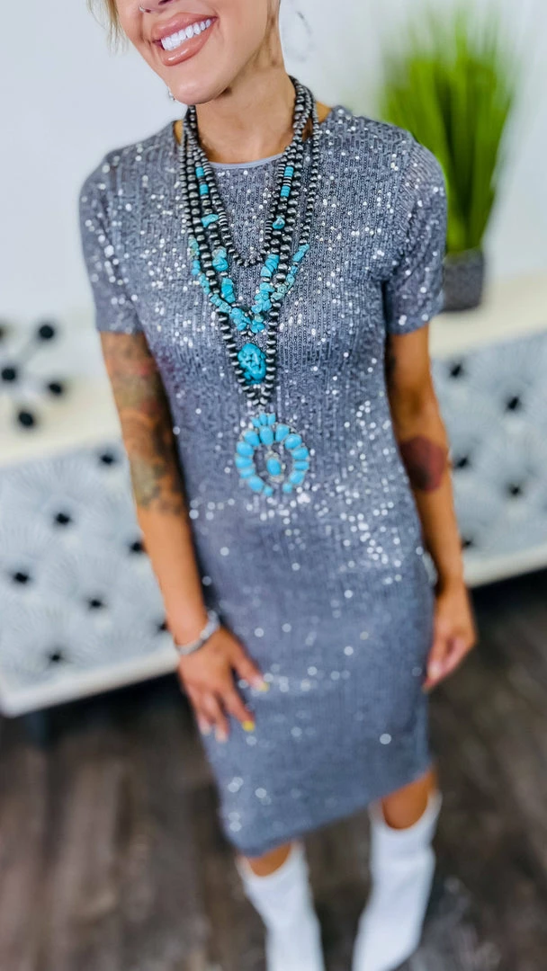 The Zig Zag Stripe knows how to slay all day in this sequinΒ silver midi dress. This party dress is perfect for all of your events. TheΒ silverΒ color is eye-catching and will add some glamor to any party. The sequins and midi length make this dress perfect for a formal event or a night out on the town.