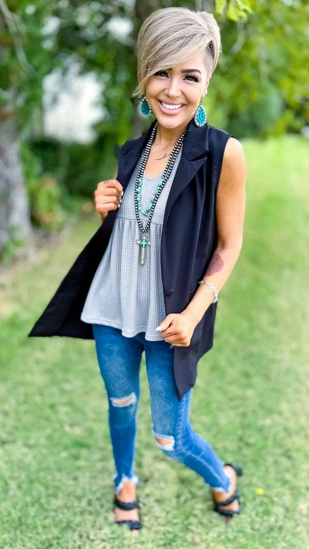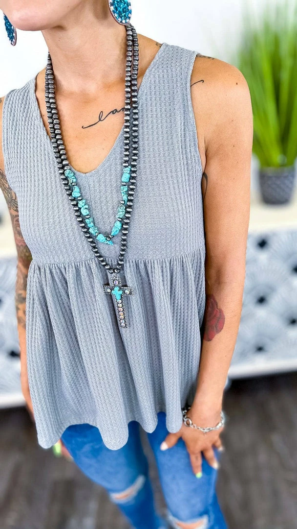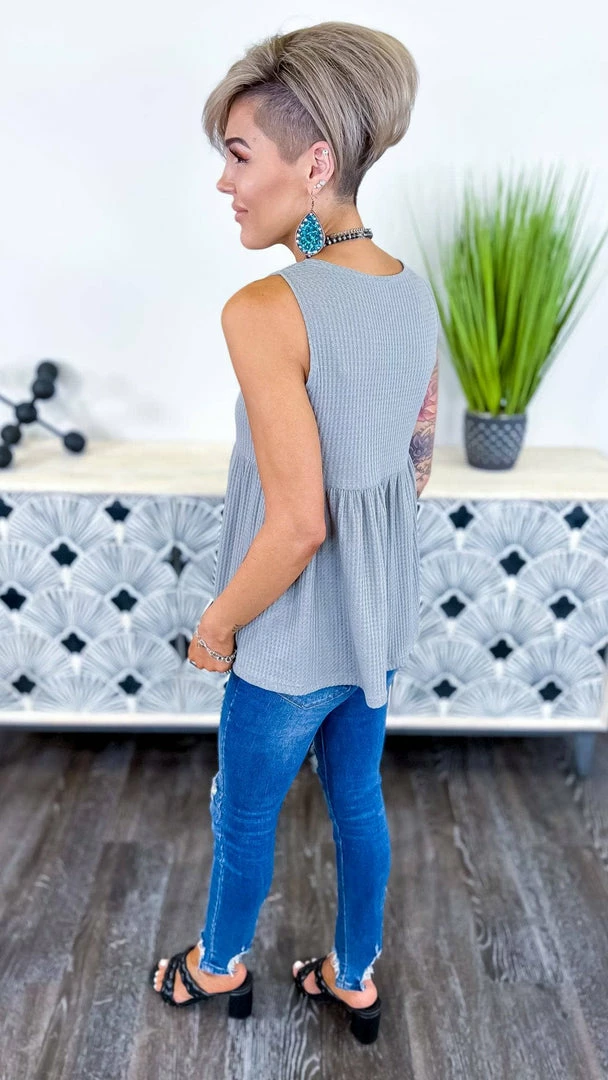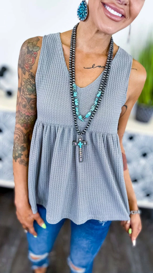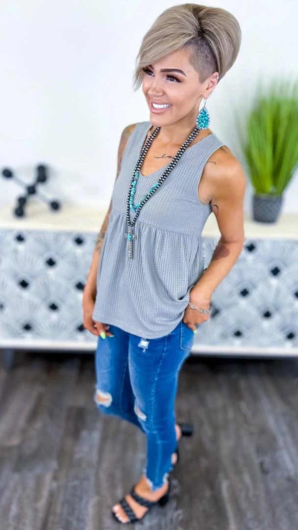 Keep it simple but cute with our new ZZS exclusive featuring a waffle knit material, sleeveless baby doll top with a flattering v-neck, and super relaxed fit! You will be able to rock thisΒ top all season long, whether it’s jeans and platform wedges or shorts and sandals.Β