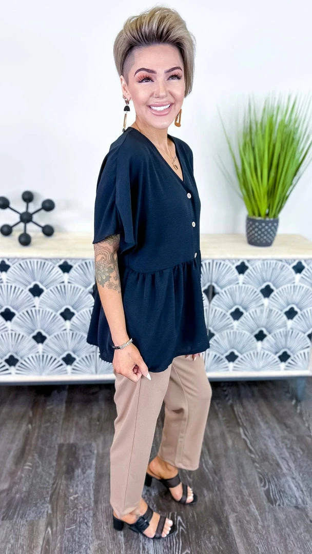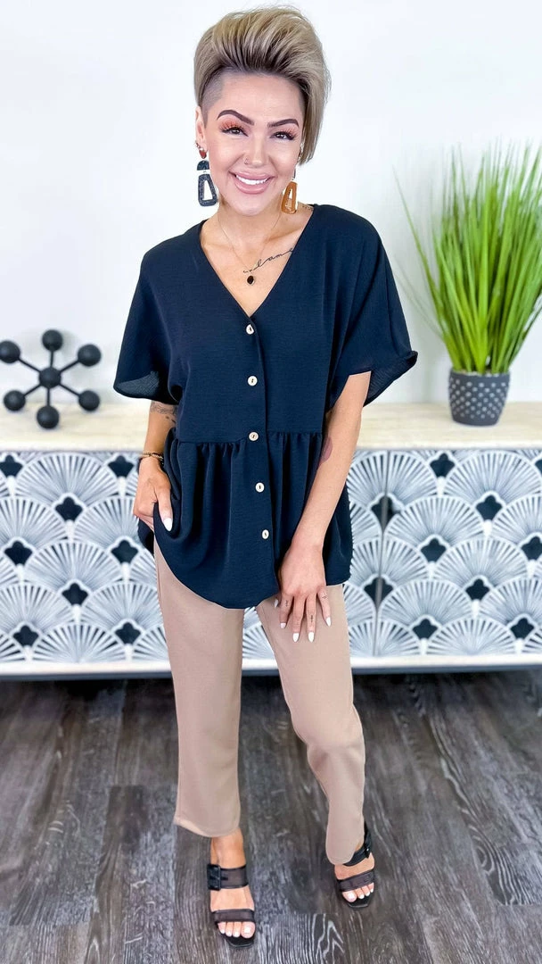 Made by US for YOU!Β A classic and comfy pant that will quickly become a favorite.Β Featuring an elastic waist band, front pockets, crop length and a straight leg cut.Β Perfect for work or a night out.