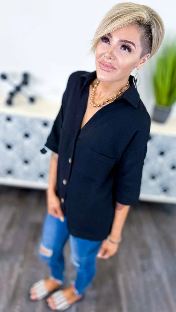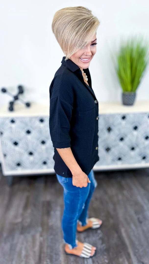 TheΒ black top you’ve been searching for. A lightweight and gauzy top to keep you comfortable all day long. TheΒ black color is perfect for spring and summer and the 3/4 sleeves keep you from getting too hot. The best part? It’s a ZigZag Stripe exclusive. Wear it to work with a blazer or dress it down for a more casual look.