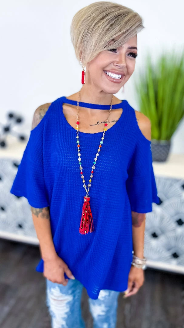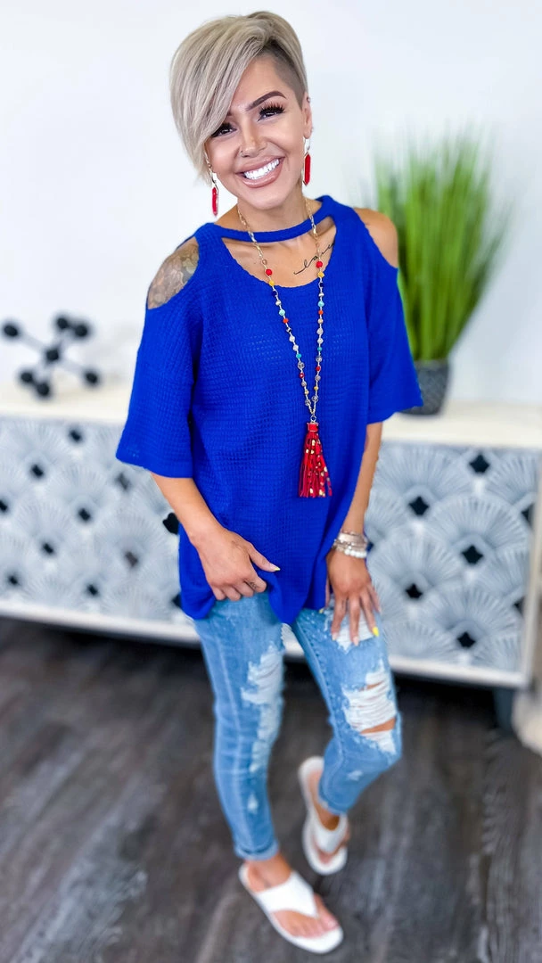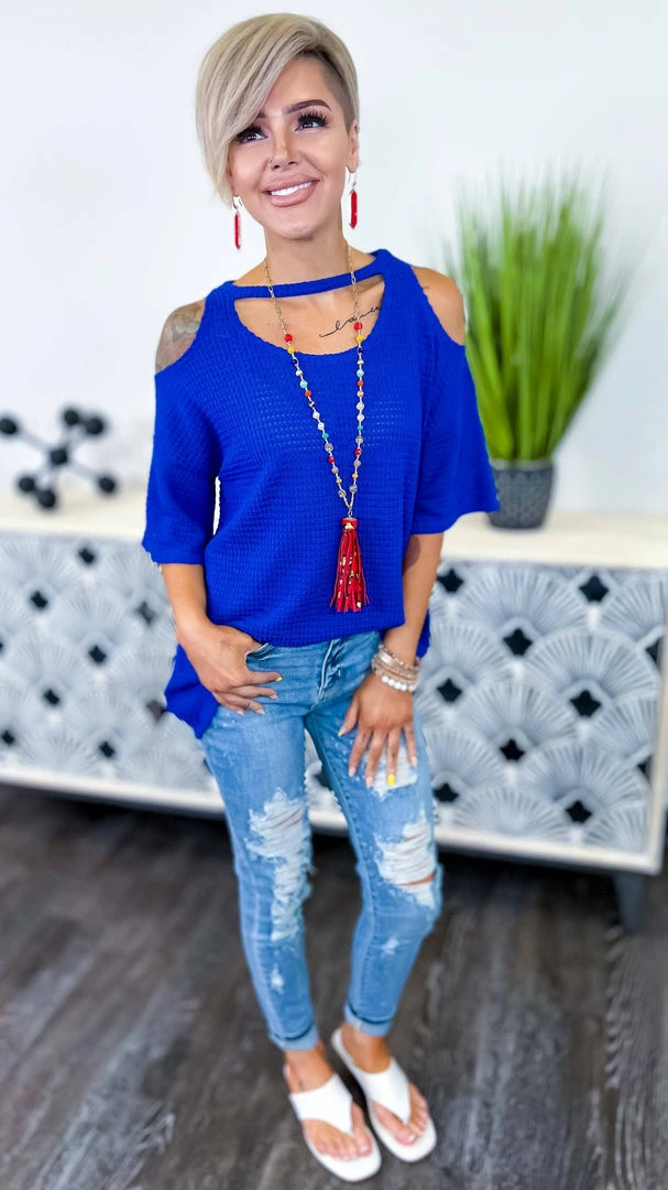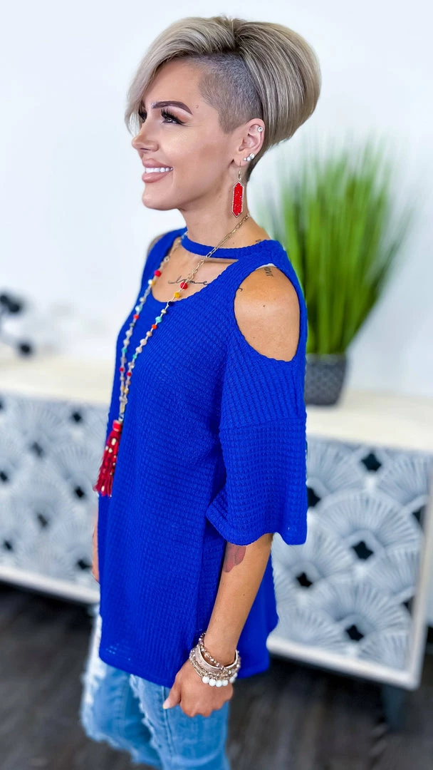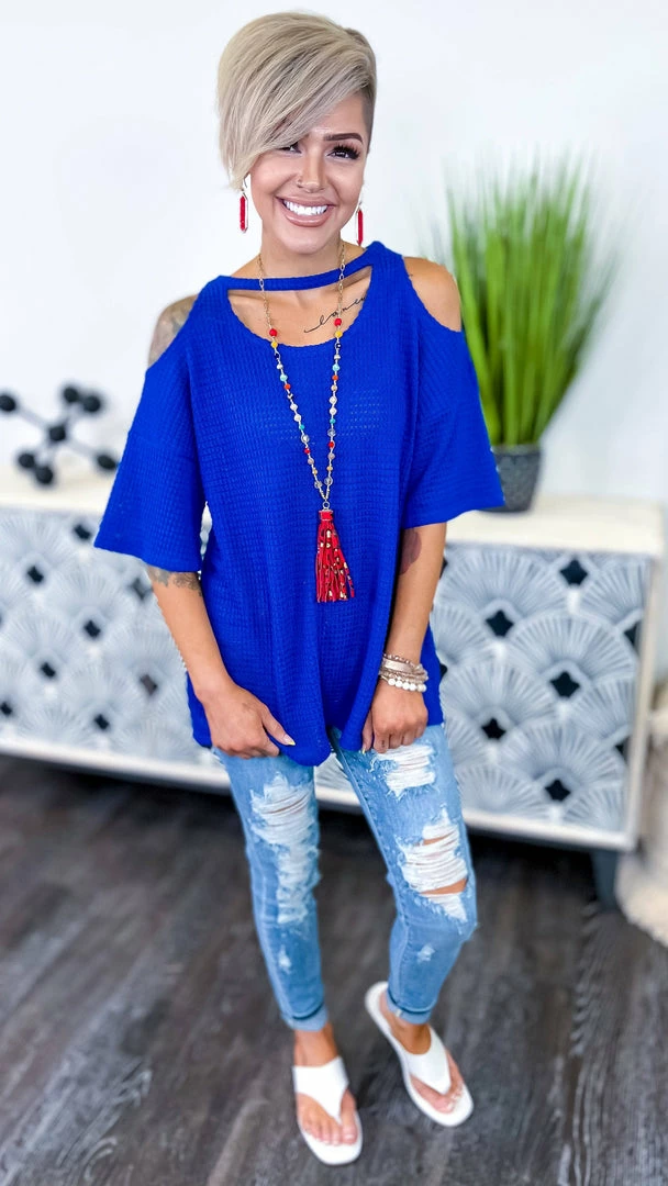 Feel confident and fabulous in this ZigZag StripeΒ Blue Cinema Date Top. With the flattering cut outs and short sleeves, this top is perfect for a night out. The waffle fabric is comfortable and breathable, ensuring you’ll feel good all night long. Plus, theΒ blue color is perfect for versatile styling. This cute date night top is sure to stand out at any event because it was made by US for YOU.