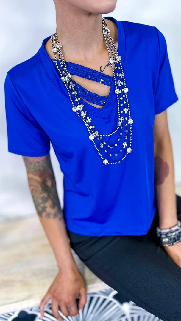 Ready to shine? This top was made for you. With a sequin cage detail, it’s perfect for an outdoor party or a night out on the town. The V-neck design is both flattering and stylish, and the short sleeve silhouette ensures that you’ll stay cool and comfortable all night long. With this top, you’re guaranteed to turn heads and light up the roomβliterally.