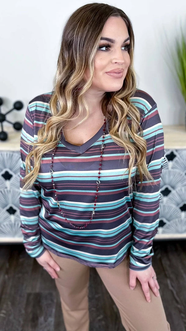This top is sure to surprise you in the best way possible. With a nod to the classic stripe, this top is anything but ordinary. With a v-neckline and long sleeves, it’s the perfect top to wear when you want to feel your best. Whether you’re dressing up or dressing down, this top is sure to please. Wear it with jeans or leggings for a relaxed and comfortable look.