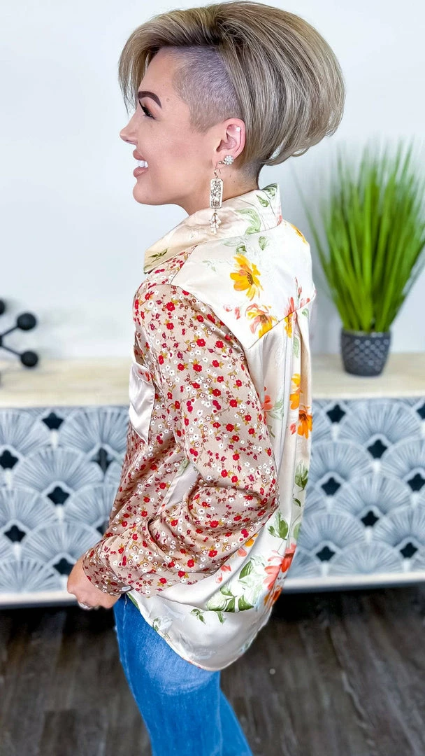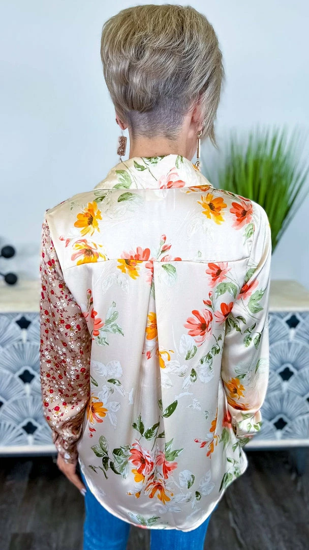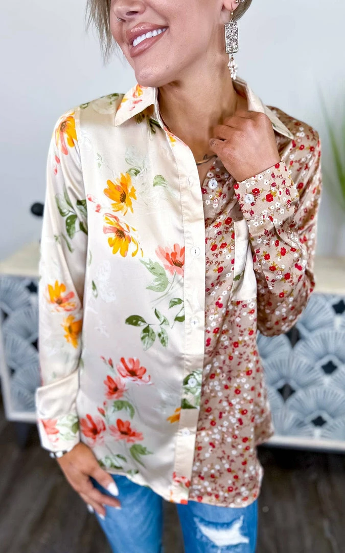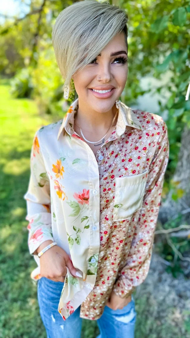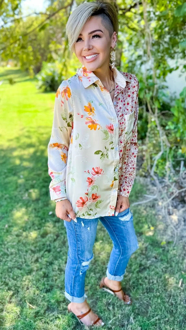 We’ve designed this ZZS top for all your diva days! Featuring a fun floral two-tone colorblock, button-down front, and long sleeves. This top will be so cute tucked into jeans or denim shorts with a fun heel!Β