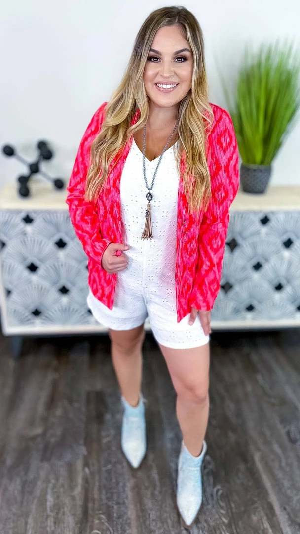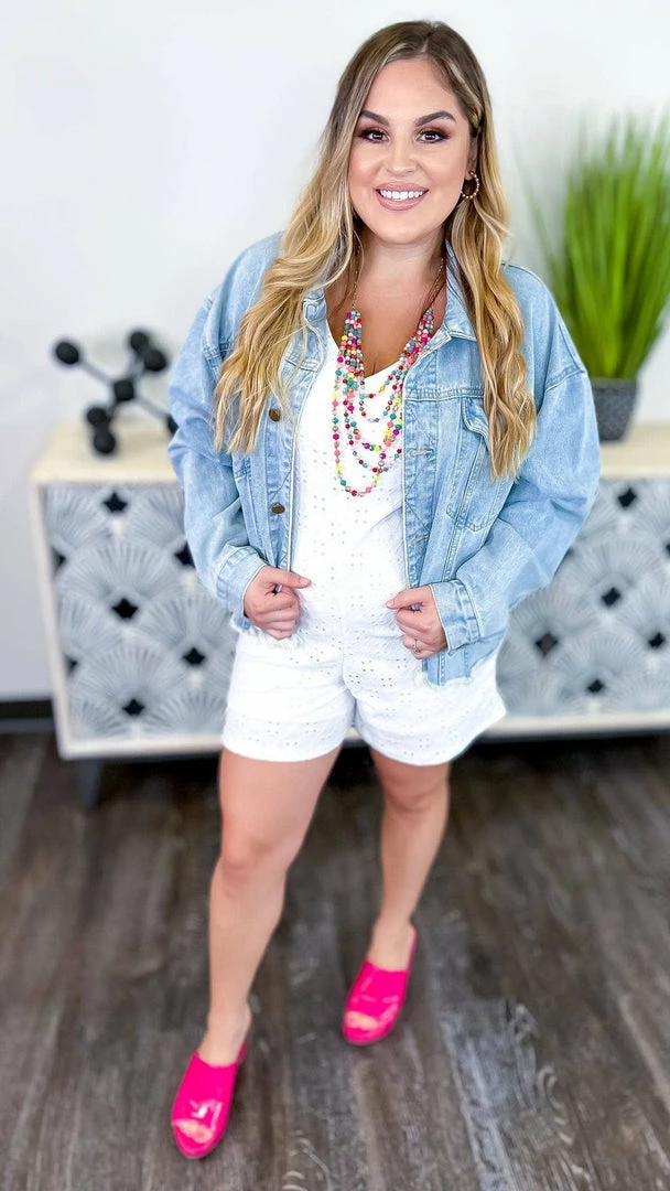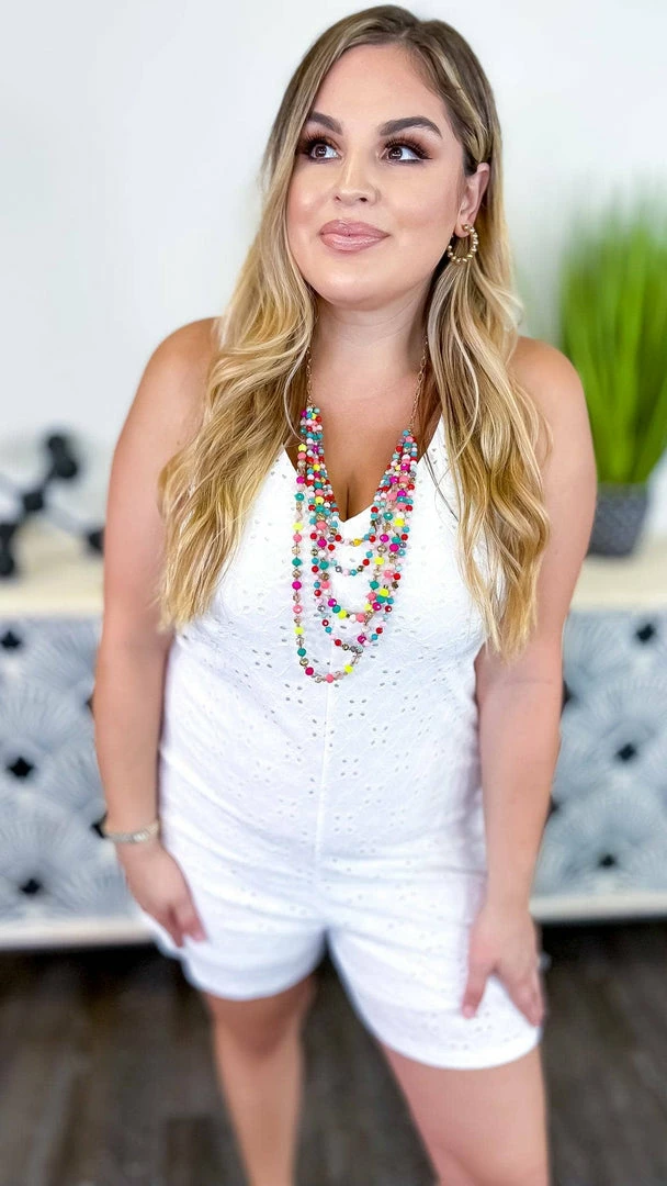 This romper is perfect for any occasion! The Graceful Feelings Romper is made with beautiful eyelet fabric and delicate lace. It has a solidΒ white color that makes it easy to dress up or down. With its comfortable fit and elegant style, this romper is a must-have for any summer wardrobe.
