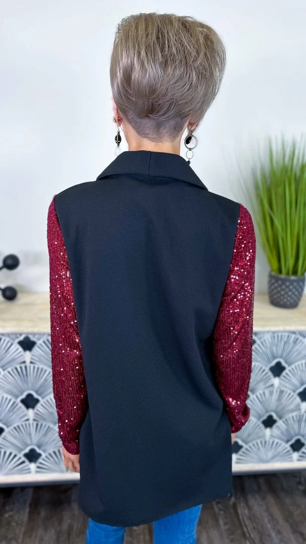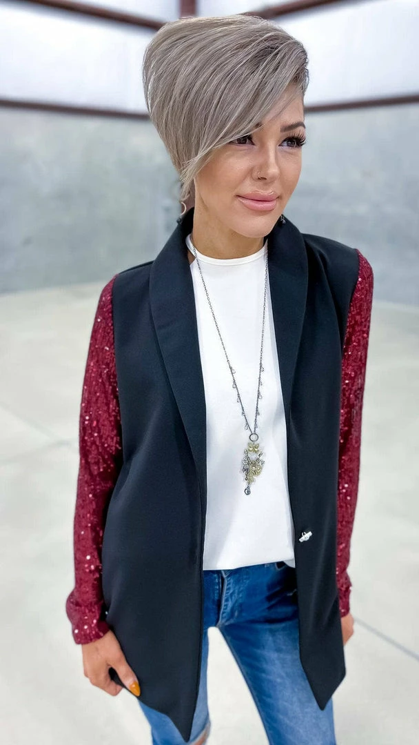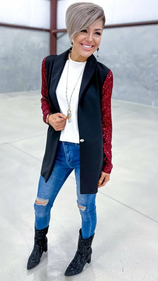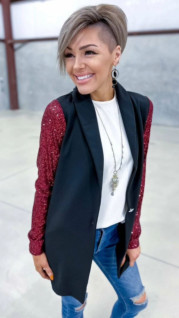 The ZigZag Stripe’s Made For The Stage Blazer is the perfect layering piece for adding some glamor to your everyday look. Amp up your style for a night on the town with this dazzling blazer. With its versatileΒ black color and chicΒ wine-colored sequin sleeves, it’s perfect for making any outfit dazzle. Whether you’re dressing up for a special event or just want to feel a little more glam, this blazer is sure to add some drama. Add it to your wardrobe and you’ll never look back.