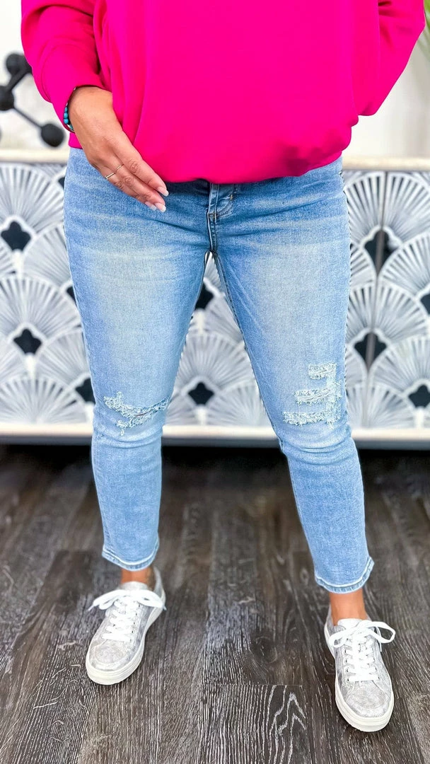 With a modernized high waist and distressed detailing, these jeans are perfect for the girl on the go. With a versatile medium wash and ripped detailing, these jeans can easily be dressed up or down. The perfect jeans for just about any occasion, these will become a staple in your wardrobe.