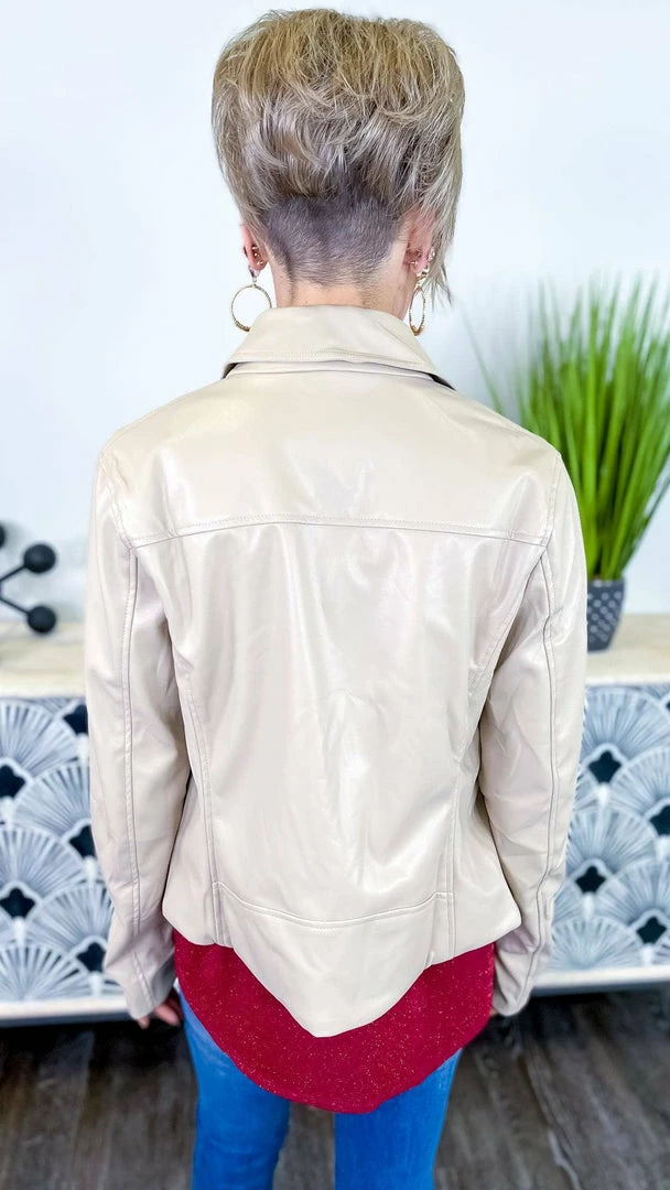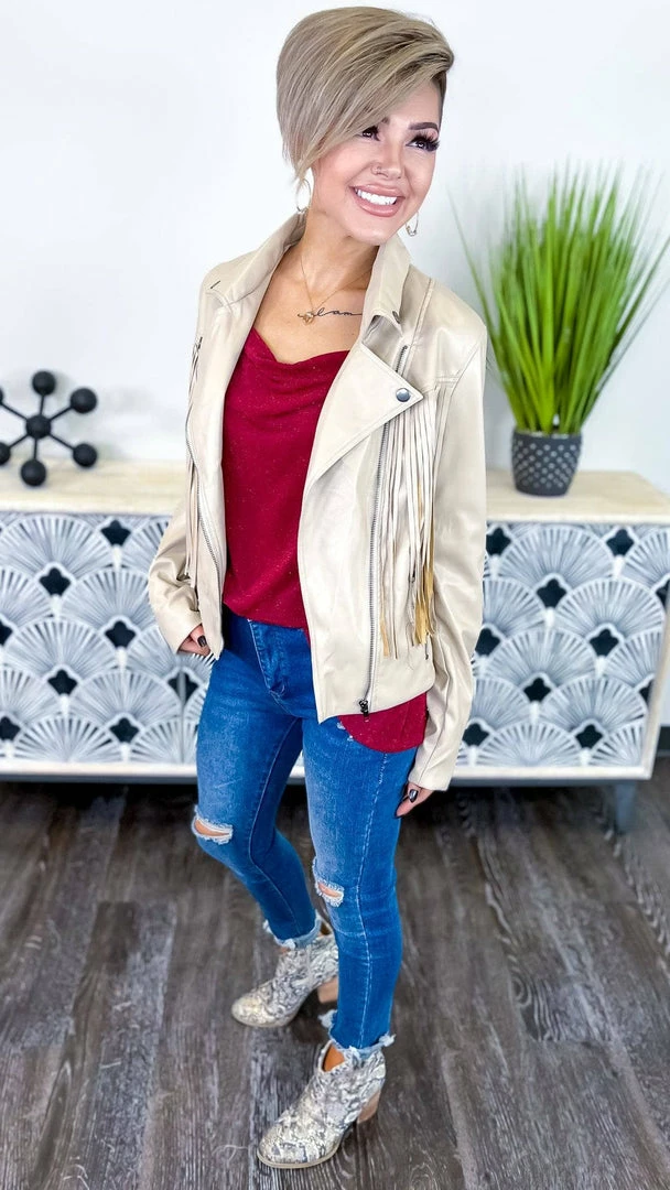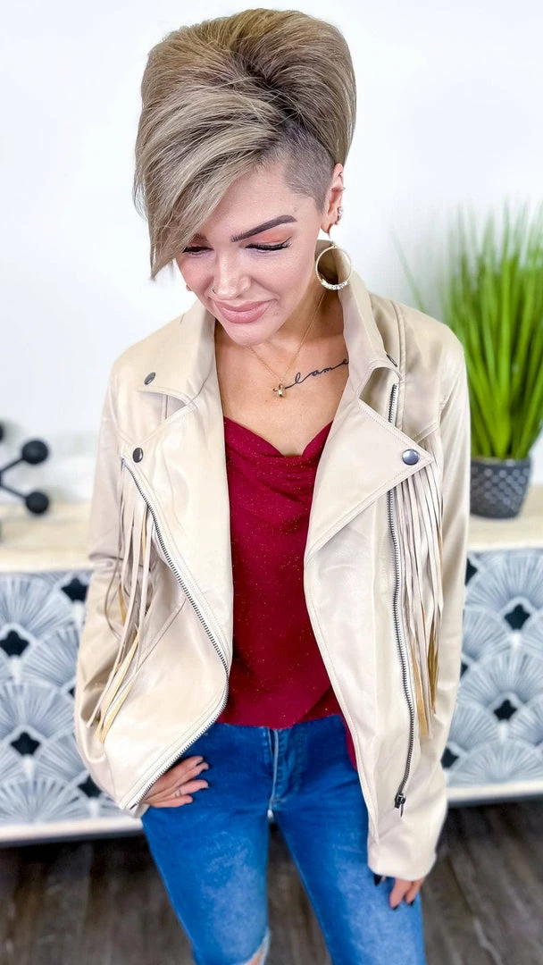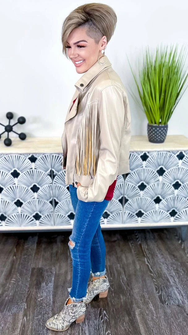 The perfect jacket to take your style up a notch.Β TaupeΒ is always in style and this biker jacket with fringe details adds a touch of boho charm. With a versatile style, this jacket can be dressed up or down. Stay warm and look stylish in thisΒ Taupe Fringe Benefits Jacket.