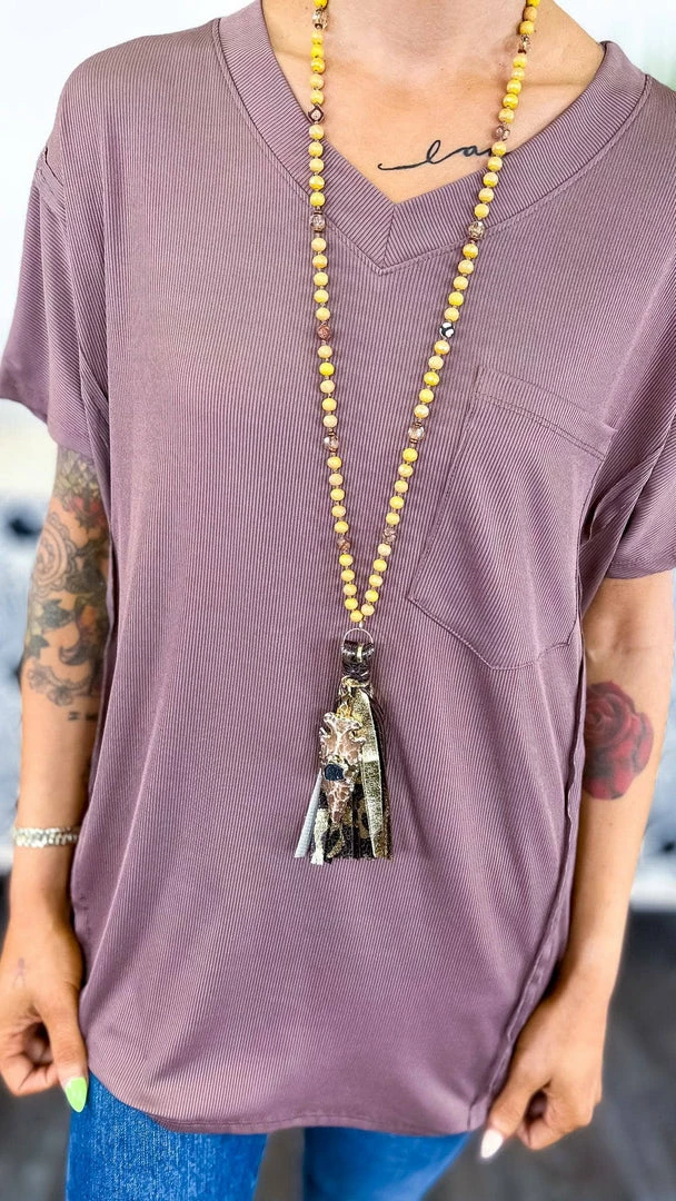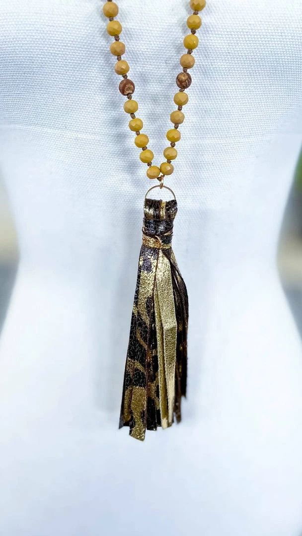 Tassel necklaces are so trendy and this one is BEAUTIFUL!Β Β Gorgeous beads that lead to a tassel pendant that contains strips of gold leopard print and a arrow head embedded with a black stone.