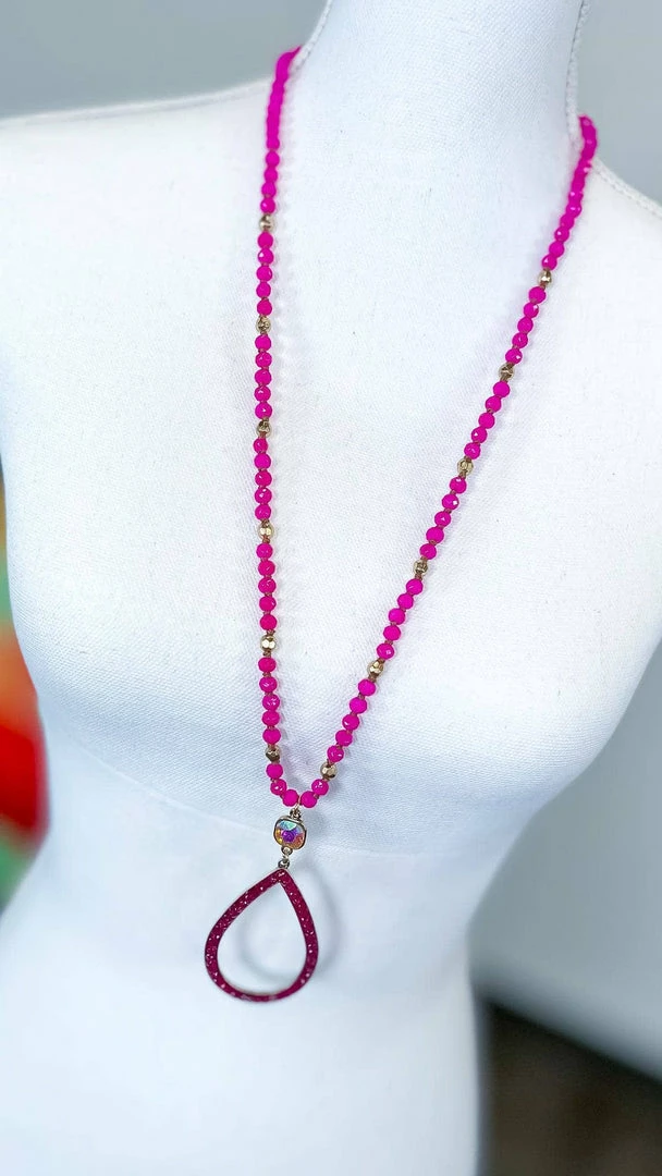 This colorful and eye-catching necklace is a must-have for any woman’s jewelry collection. The unique fuchsia beading and striking fuchsia crystal teardrop pendant make this necklace a statement piece that you’ll love to wear. Whether you’re dressing up for a special occasion or just accenting your everyday style, this necklace is sure to turn heads. Add some glamor to your look with this gorgeous Fuchsia Hadley Necklace.