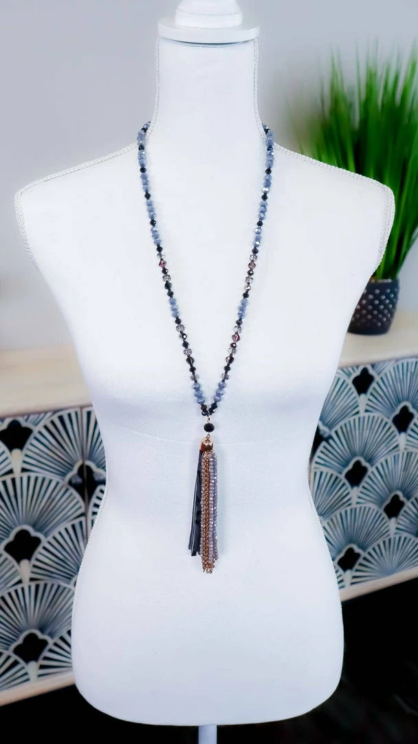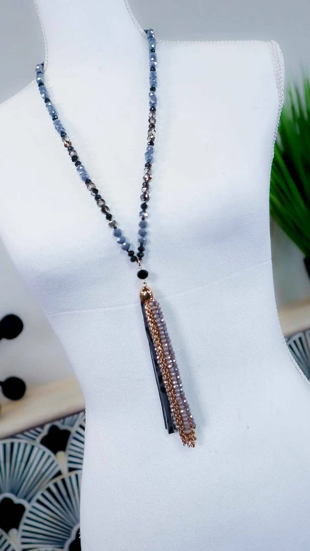 Make a statement with this beaded tassel necklace. Add some fun and fringe to your style with this tassel necklace. With itsΒ classicΒ grey color, it’s the perfect way to add a pop of color to any outfit. Whether you’re dressing up for a party or just accenting a casual look, this necklace is sure to turn heads.