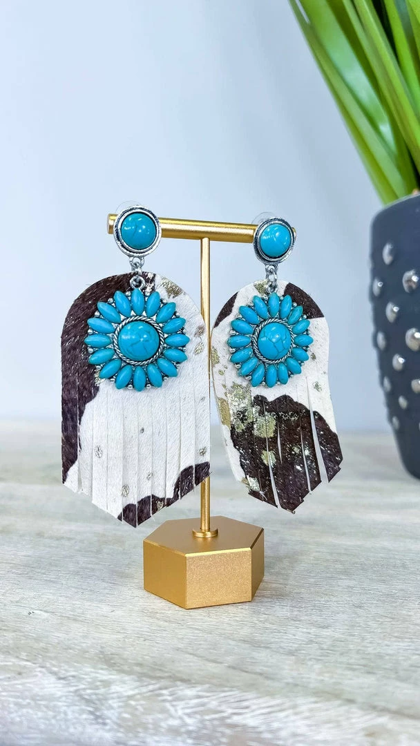 These Kenzi Earrings are a must-have for any fashionista. With cow print fringe and a turquoise concho pendant, these earrings are perfect for adding a touch of boho style to any outfit. Whether you’re dressing up for a night out or just looking to add a little something extra to your everyday look, these earrings are sure to do the trick. So go ahead and add a little edge to your style with these Kenzi Earrings.