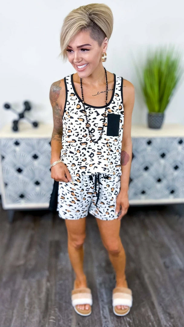 Step up your style game with this Living & Lounging Set. This two piece set comes complete with a tank top and shorts, both in a trendy leopard print. Made from comfortable and breathable fabric, this set is perfect for a relaxing day at home.
