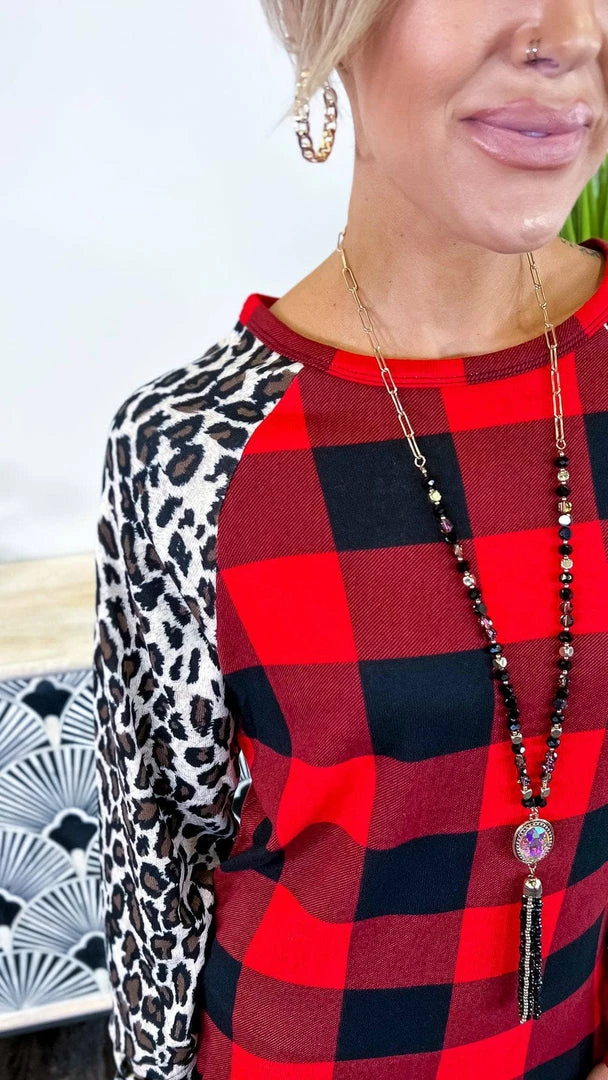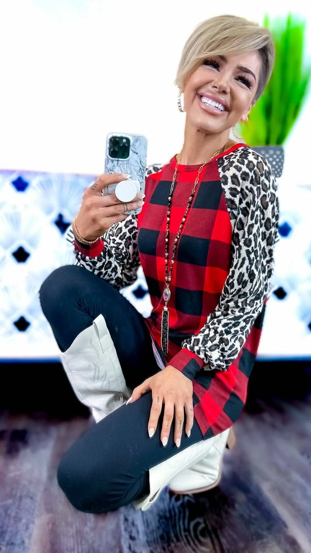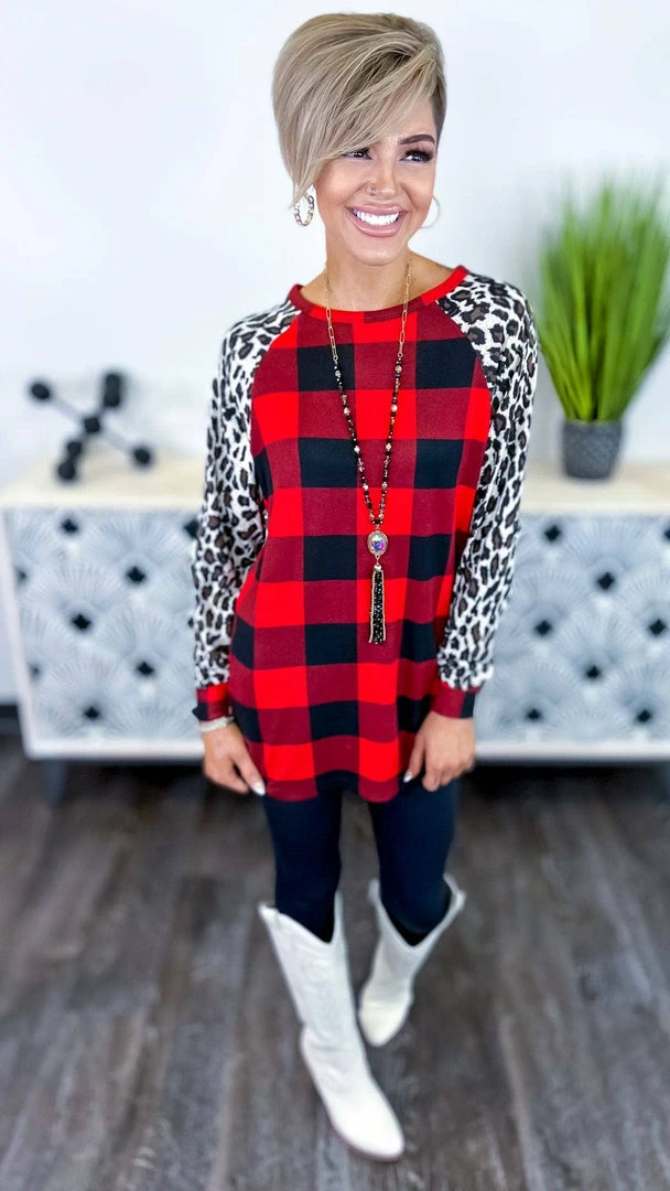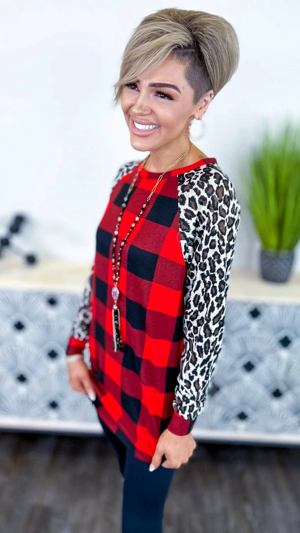Add a touch of fun to your style with this unique colorblock top. This stylish top features a classic buffalo plaid print body and fierce leopard sleeves. It’s perfect for mixing and matching with your favorite bottom pieces. With its comfortable and relaxed fit, this top is perfect for everyday wear.