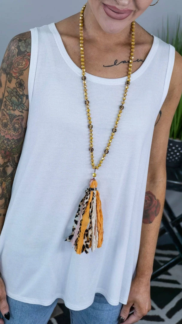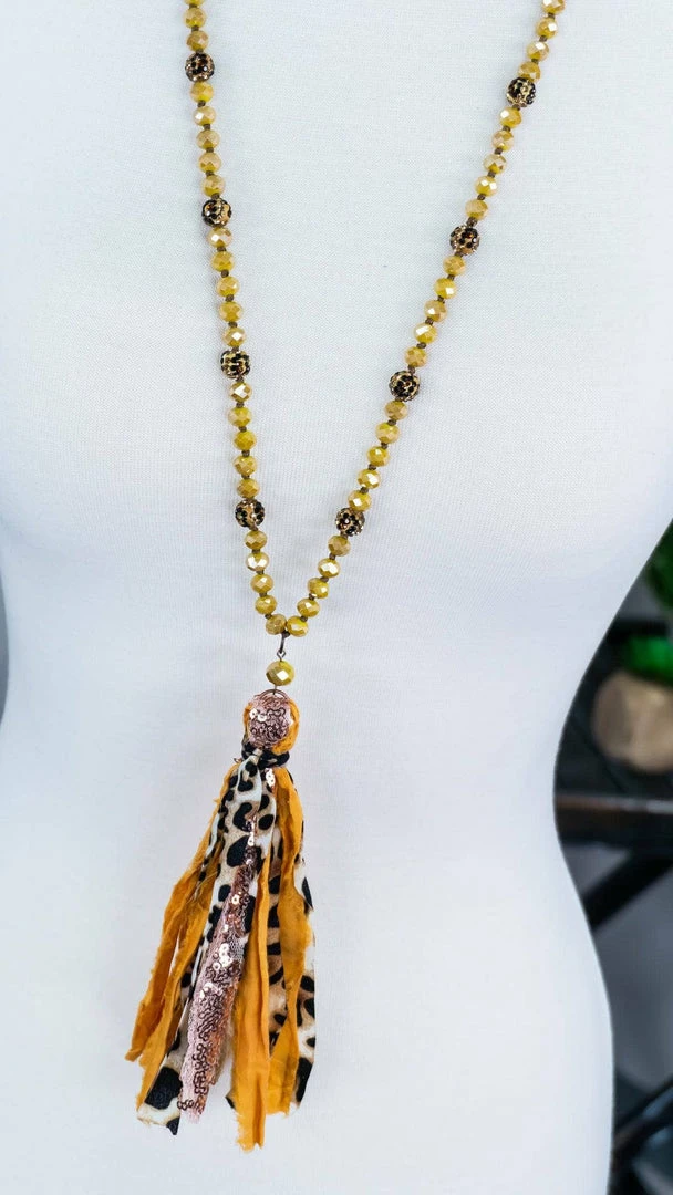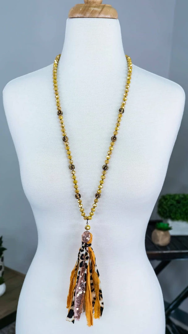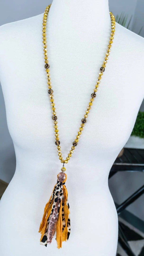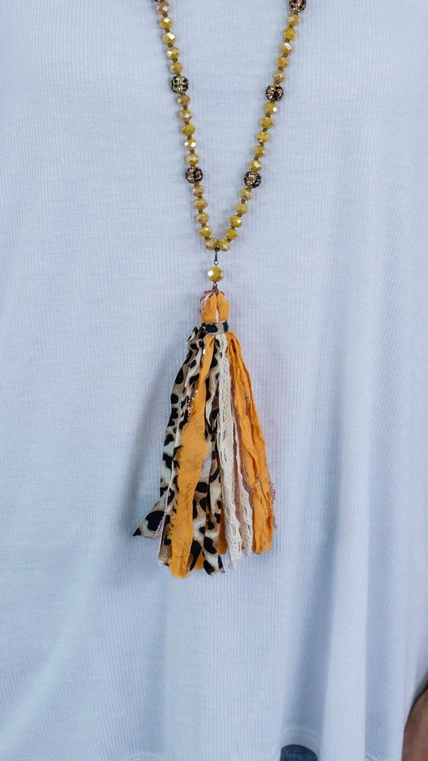 You’re sure to make a statement with this leopard and yellow tassel necklace. This necklace is sure to add a pop of color to all your outfits.