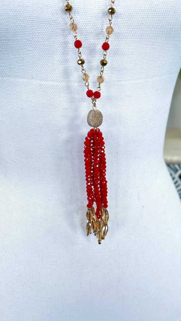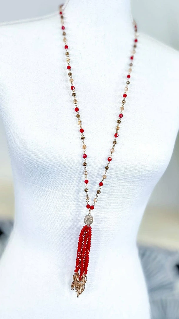 Add a touch of elegance to any outfit with this red tassel necklace. The beaded tassel detail hangs delicately around your neck, adding a touch of sophistication to any look. Whether you’re dressing up for a night out or keeping it casual for a day at the office, this necklace is the perfect finishing touch.