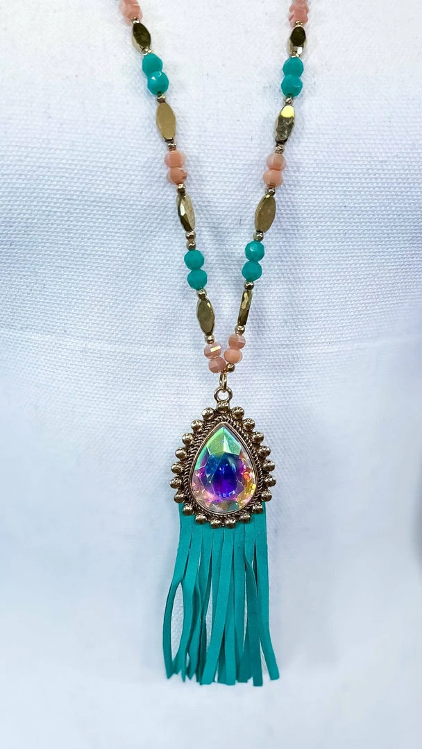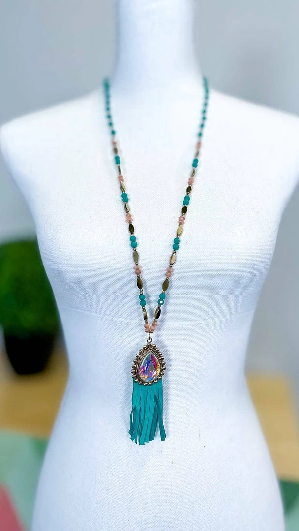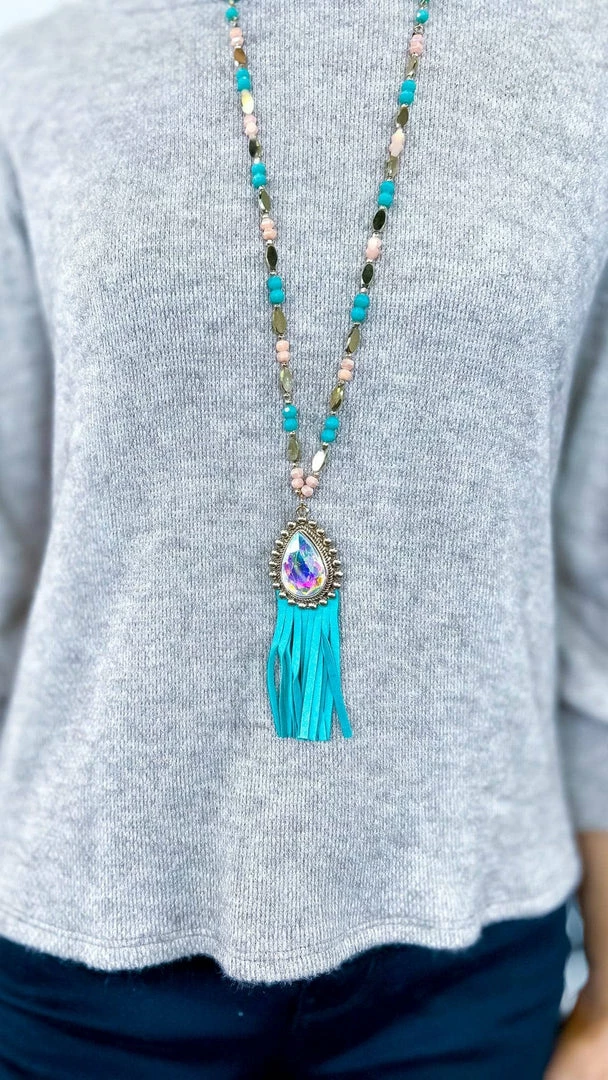 TheΒ Turquoise Hayleigh Necklace is the perfect accessory to add some pizzazz to your outfit. TheΒ turquoiseΒ fringe necklace with a crystal pendant is a great way to add some fun and flair to your look. The necklace is also a great way to show your personality and style.