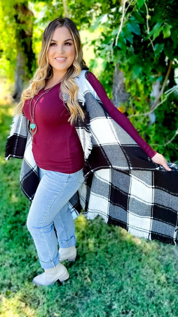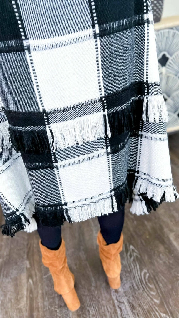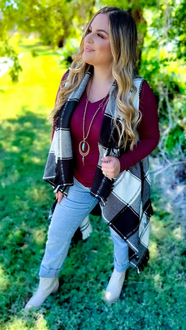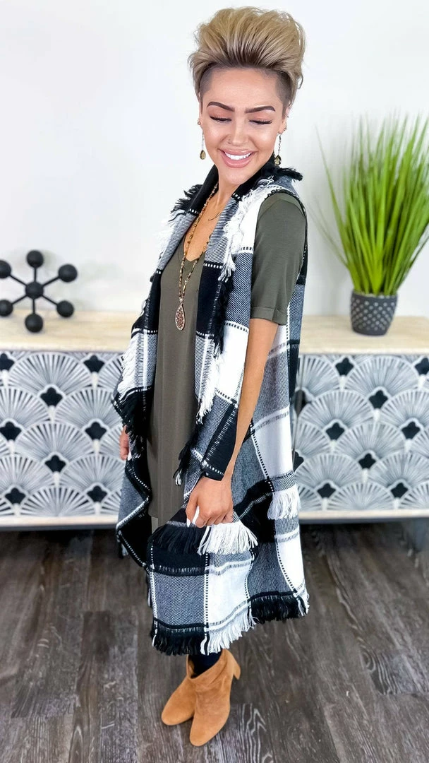 This plaid vest offers the perfect accent piece to your fall outfit.Β We especially love the fringe trim. Pair with a solid black orΒ white top for a classic monochromatic look!